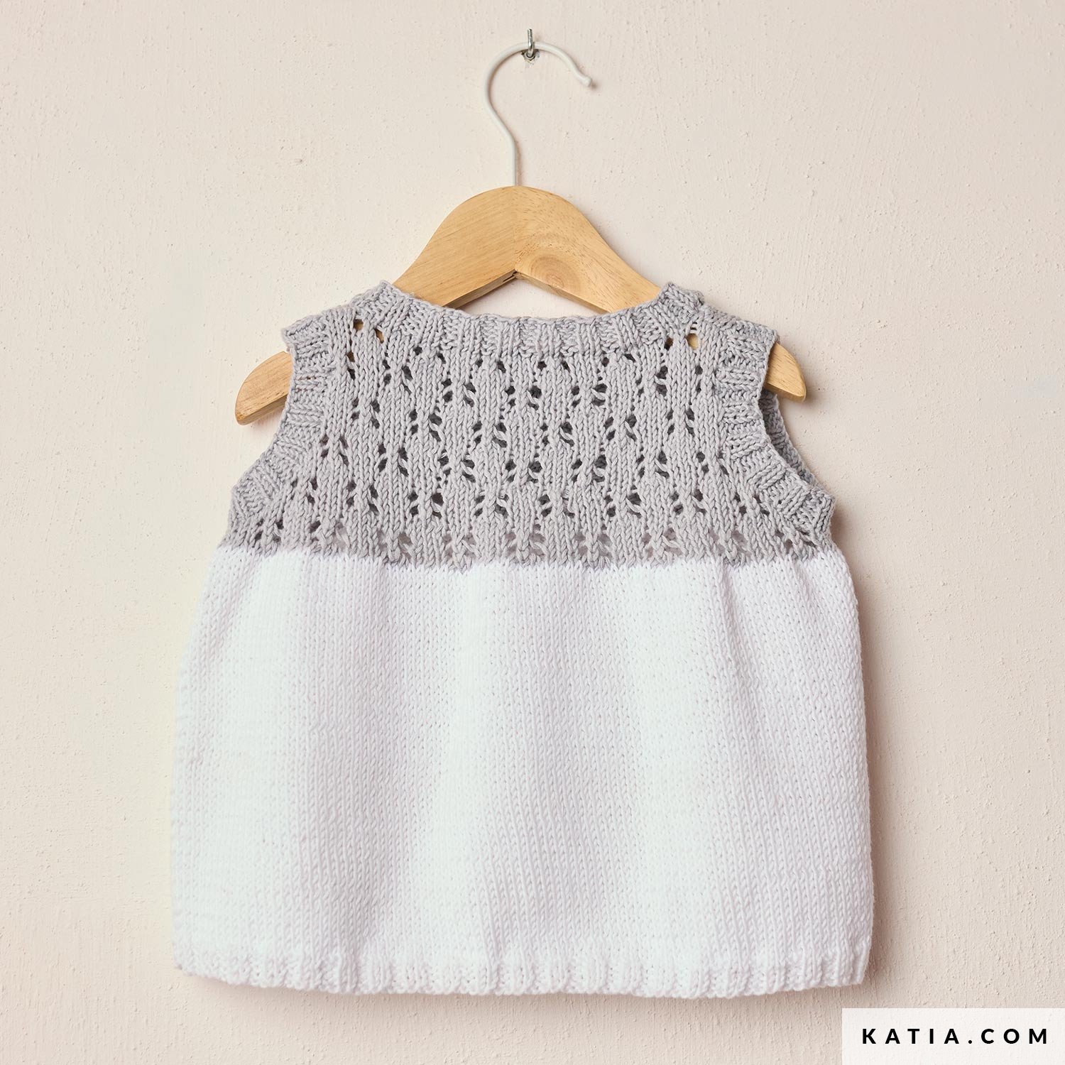 Fill your baby’s wardrobe with softness with this two-toned knitted top. The design pairs white stockinette stitch with a delicate contrast lace yoke, buttoned at the front with small buttons. Made with Katia Fair Cotton, an organic cotton ideal for sensitive skin. Available in the Katia Baby 116 magazine and as a PDF at katia.com. Enjoy making a light, comfortable piece for the warmest days.
