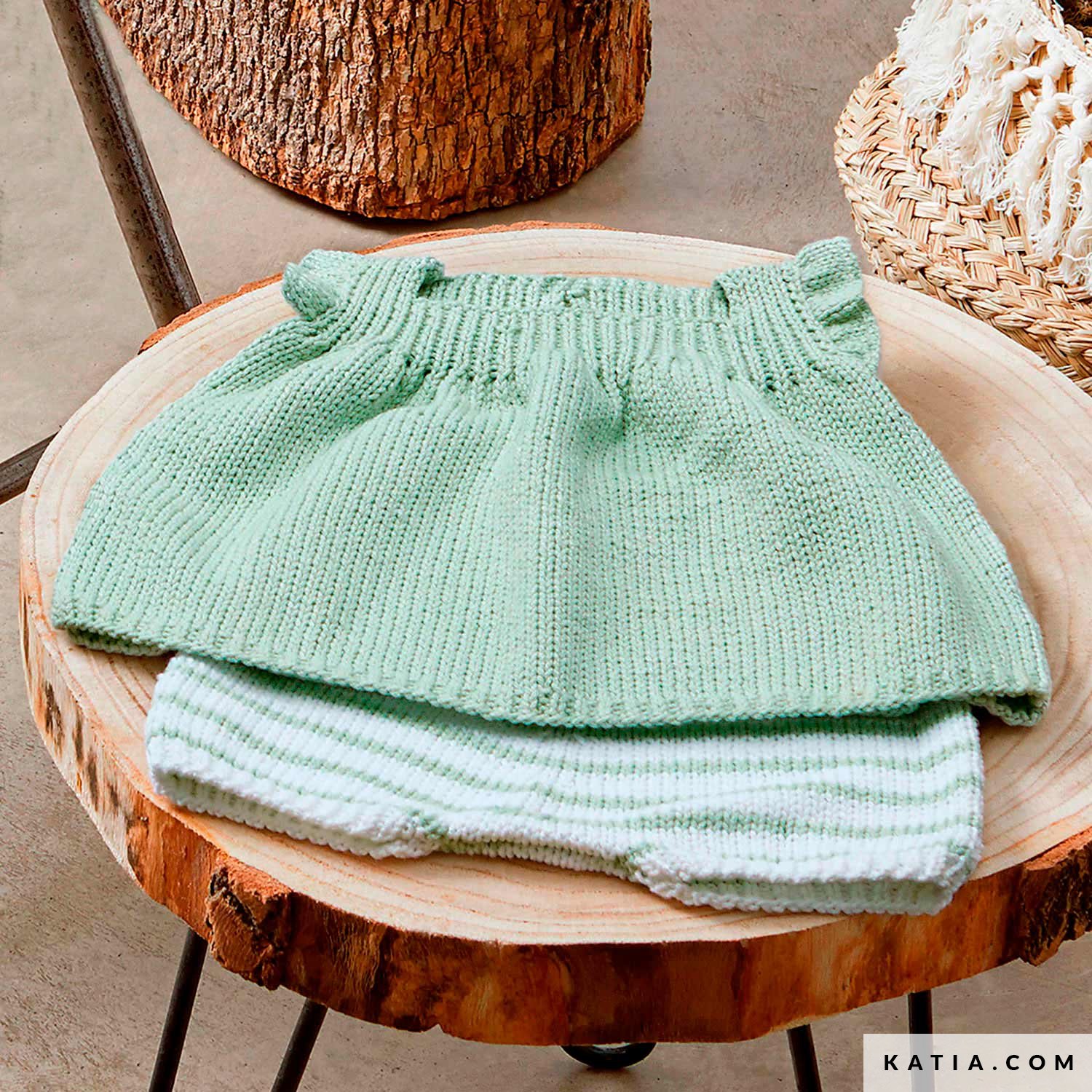 We recommend using Summer Comfort to knit a sleeveless top with a matching diaper cover for your baby. Enjoy the details of this knitted set! Like the frilled straps and the gathered front on the top or the striped baby bloomers.