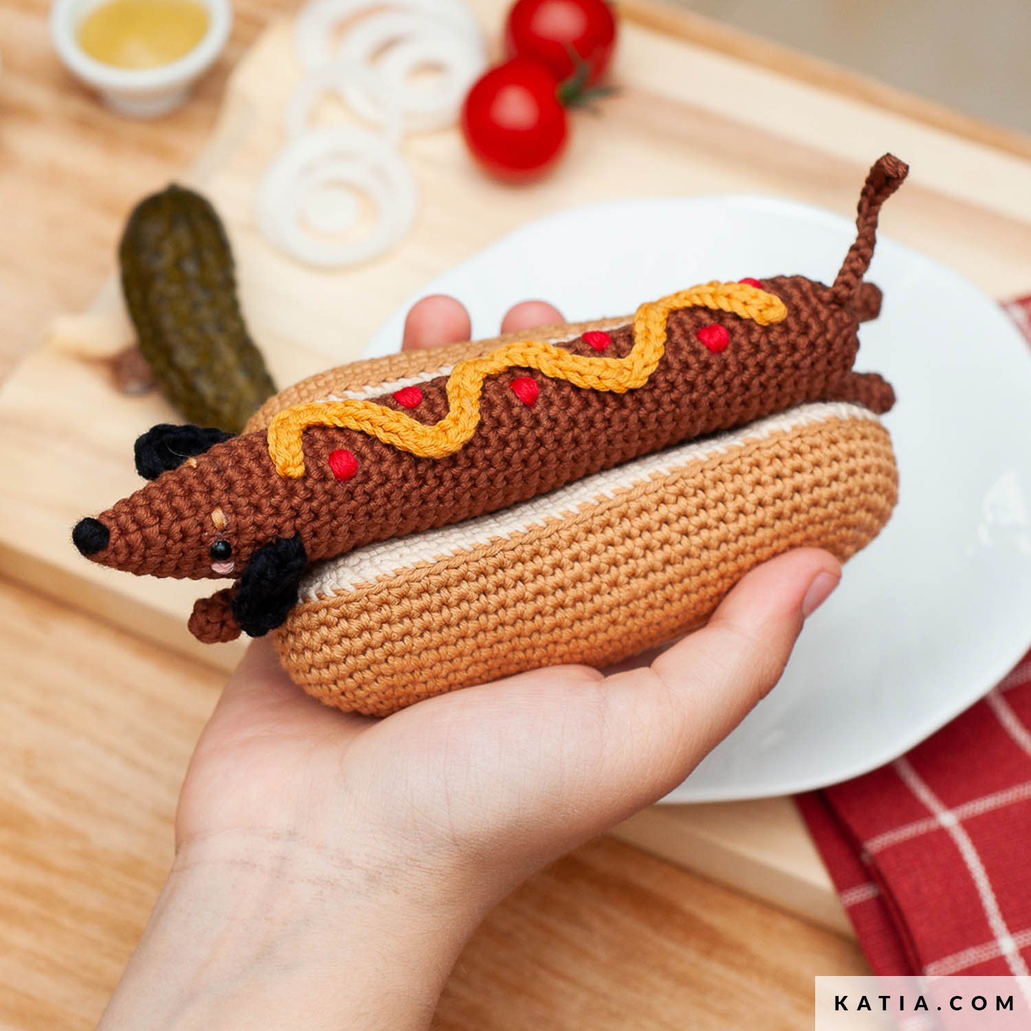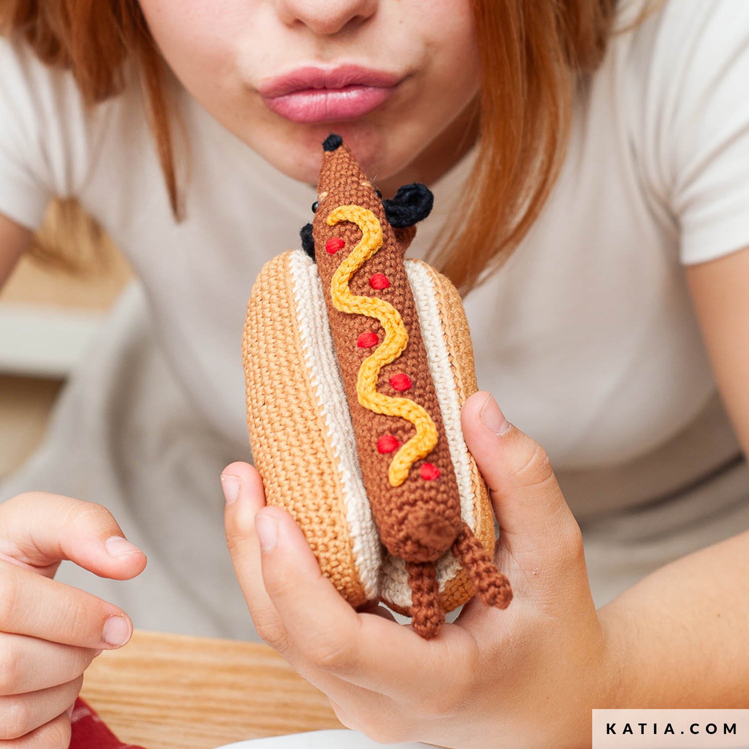 The Hot Doggy by Gallimelmas is the perfect blend of humour and sweetness: a dachshund turned into a hot dog that’s sure to make everyone smile. This clever character from the Snack Time series combines bun, mustard and ketchup, all crocheted with Katia Amigurumi, a 100% cotton double-twist yarn. Its long body, black ears and curly tail make this amigurumi a fun and playful creation. Perfect for those who love crocheting pieces full of whimsy and overflowing imagination.