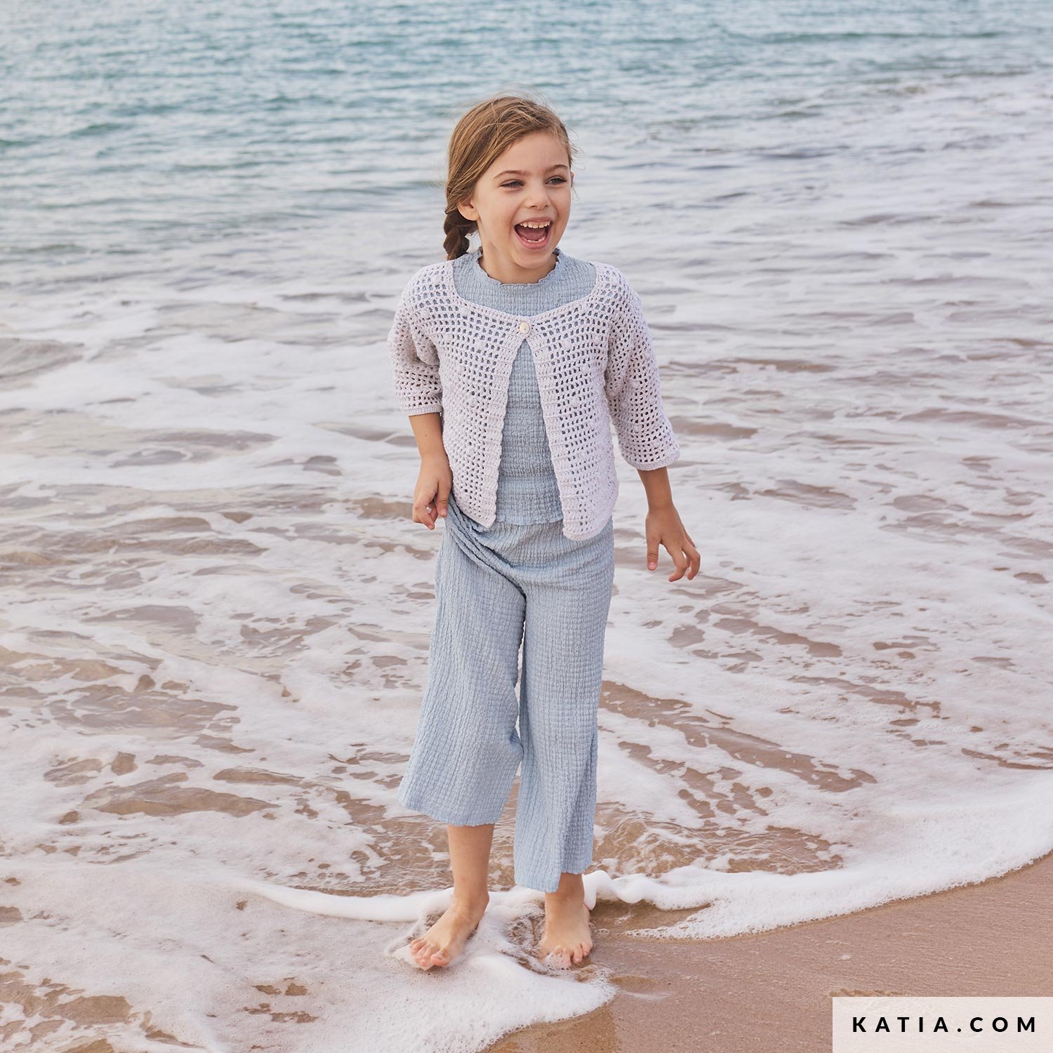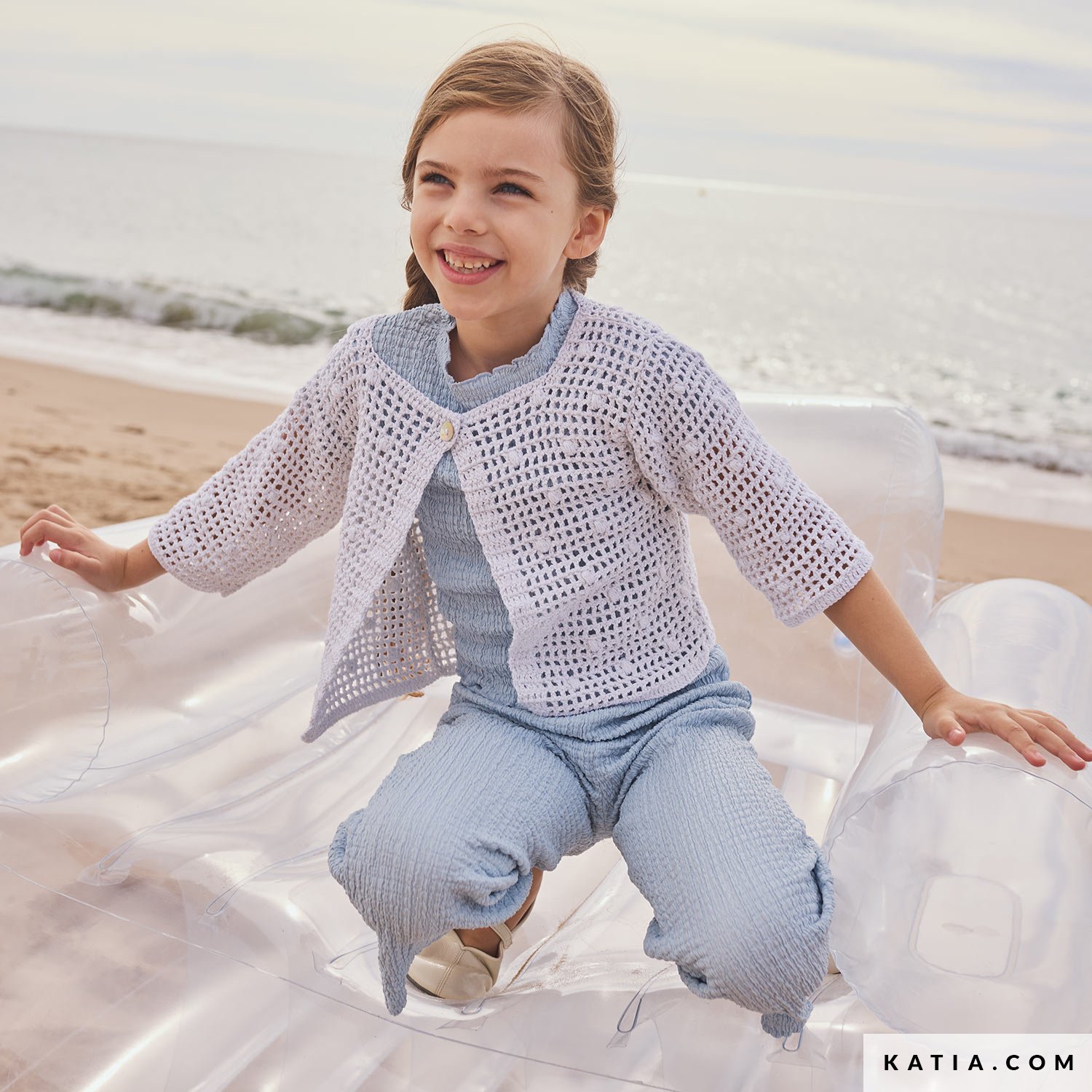 Crochet this kids’ ¾-sleeved cardigan with Katia Estrella, a subtly shimmering yarn. The cropped design combines a lace motif with small bobbles and is fastened with a button at the neckline. Available in the Katia Kids 117 magazine and as a PDF at katia.com. Enjoy creating a summer cardigan for your child or grandchild.