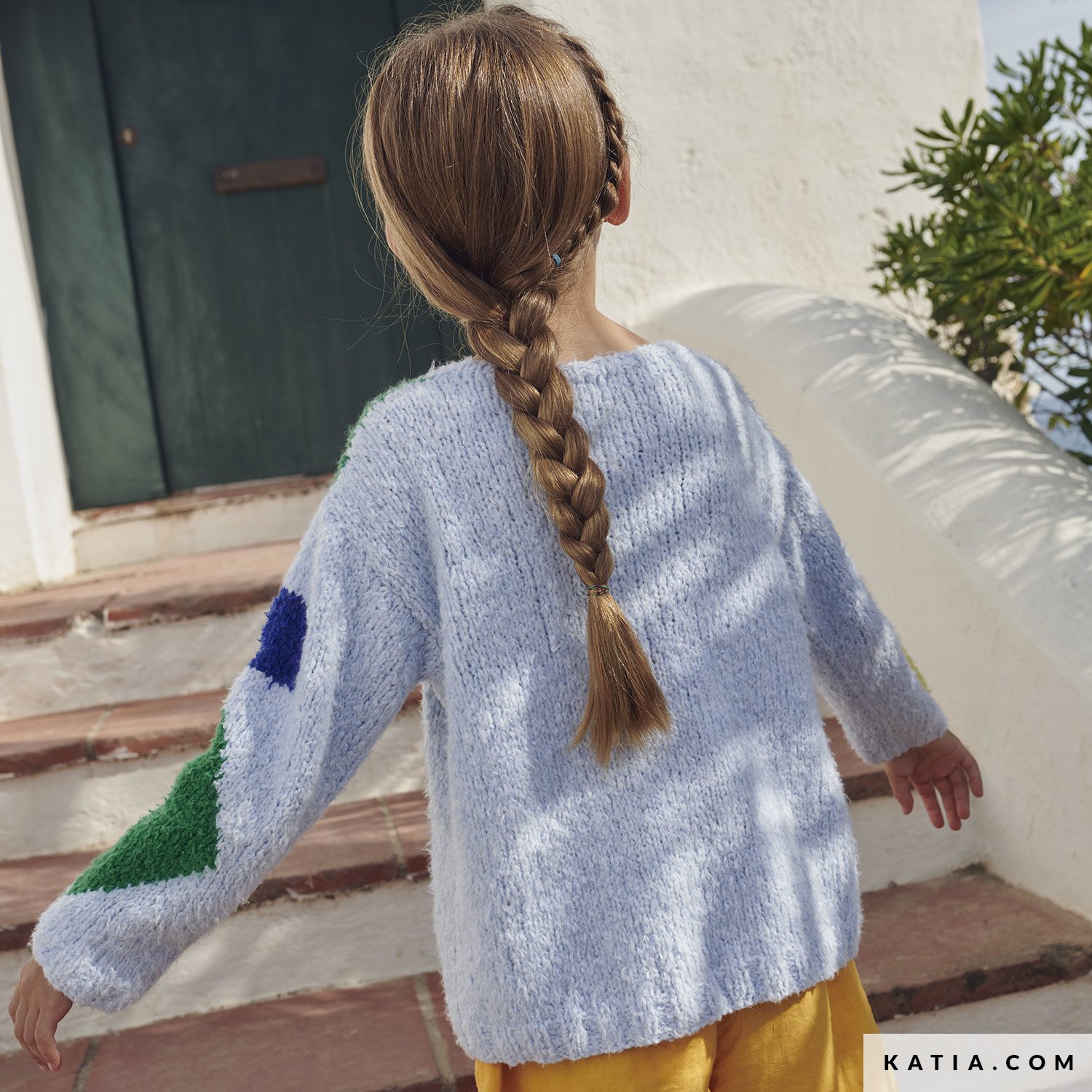 If you’re looking for a unique result, then discover everything you can do with the intarsia technique. This pattern includes instructions on how to knit a children’s sweater with geometric motifs in bright colors. Combine your favorite colors of Pluma to make an oversized stockinette sweater for children in sizes 4, 6, and 8 years.