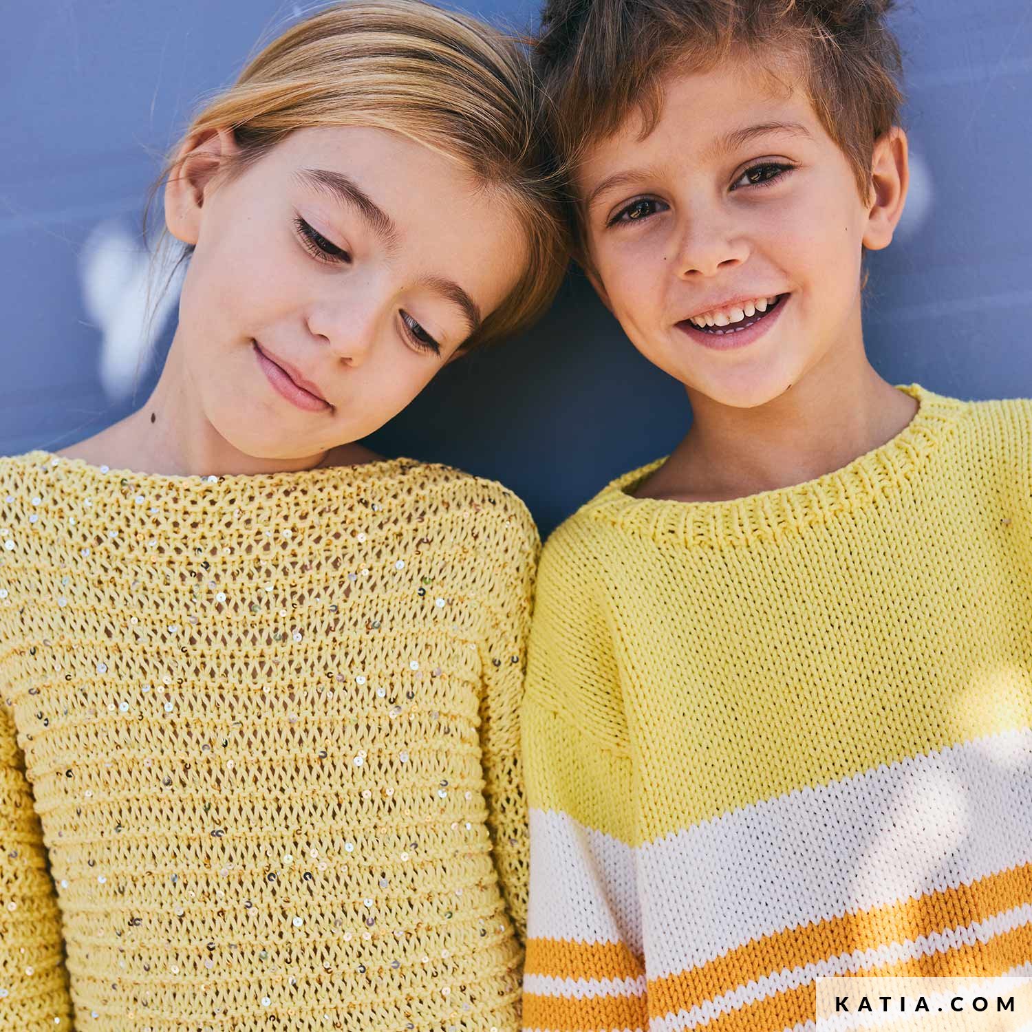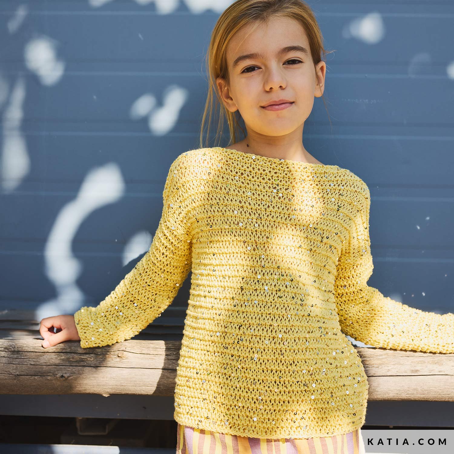 This easy children’ sweater pattern is knitted in a simple decorative stitch with Katia Cleopatra, a soft cotton adorned with delicate gold and silver sequins. The straight silhouette is light and comfortable—ideal for everyday wear with a touch of sparkle. Available in the Katia Kids 117 magazine and as a PDF at katia.com. Make a modern, playful piece for your child.