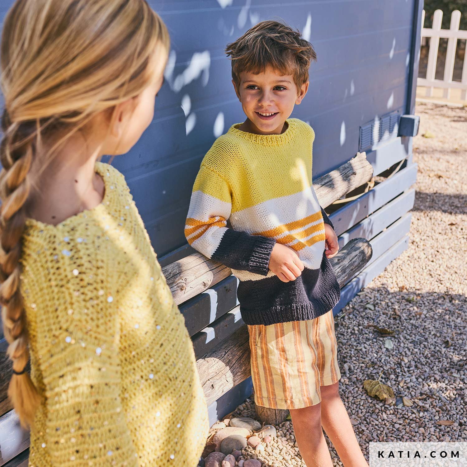 With this kids’ sweater pattern, knit an easy, comfortable garment using Katia Alabama, a soft cotton blend ideal for the changing seasons. This straight design combines color blocks with contrast stripes on the body and sleeves. Available in the Katia Kids 117 magazine and as a PDF at katia.com. Customize it with your children’s or grandchildren’s favorite colors.
