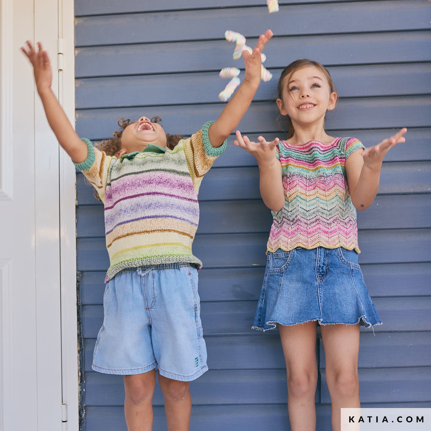 This lightweight top is worked in the round with circular needles from the top down for a seamless, comfortable fit. Katia Fair Cotton Arlequino provides a perfect-cycle print that infuses the design with color. A delicate decorative stitch creates a wavy hem, and raglan sleeves add ease. Knit a cool, colorful piece for your kid’s handmade wardrobe with just one ball of yarn.