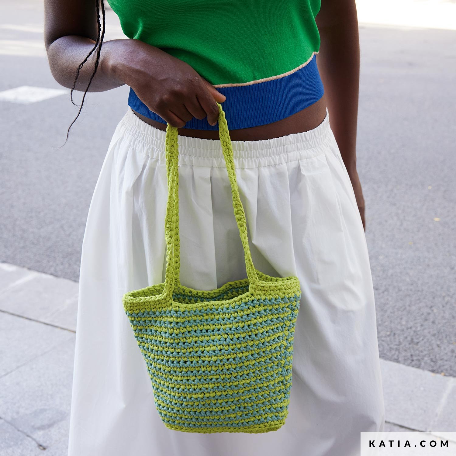 A two-toned striped Formentera Bag crocheted for a cool, modern look. WOW Rewashi delivers a lightweight finish full of personality—perfect with basics so your crochet bag becomes the star. Find the pattern at katia.com and in the Bag to Basics magazine. Enjoy the process and debut your handmade bag this summer.