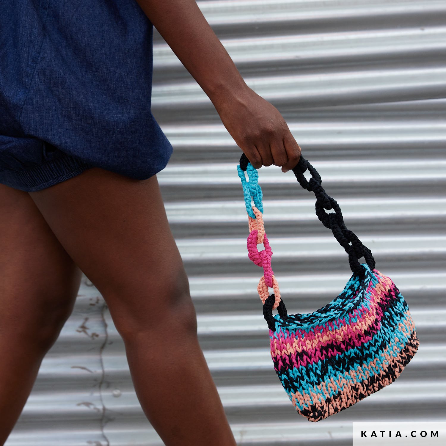 A multicolor knitted handbag designed to add texture and style to any look. It’s made with several shades of WOW Rewashi, a yarn with more body and structure for crisp stitch definition. The WOW touch is the chain-style strap, crocheted for a modern, playful finish. Pattern available as a PDF at katia.com and in the Bag to Basics magazine. Choose your favorite WOW Rewashi shades, create a unique customized piece, and show off a 100% WOW accessory.