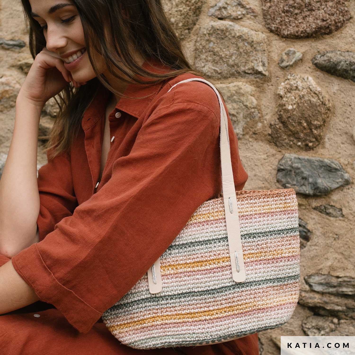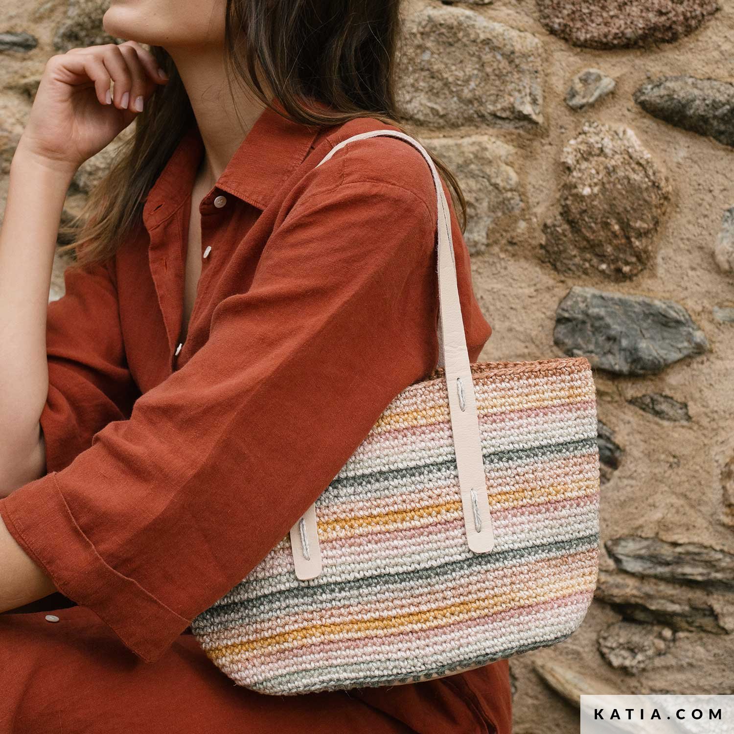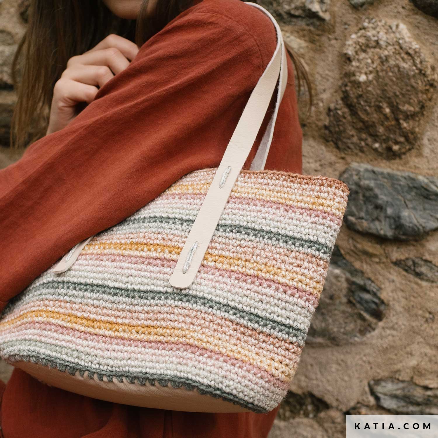 A crochet bag with matching base and straps, made with Katia The Vegan Bag Colors. Work in a spiral in single crochet for a sturdy result that’s easy to style. Free pattern available as a PDF at katia.com. Make one (or more) and carry it all summer long!