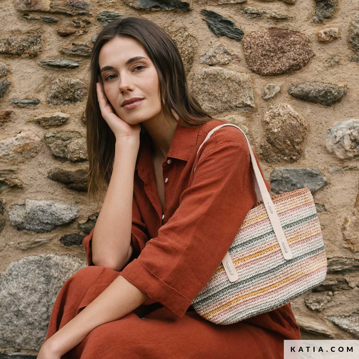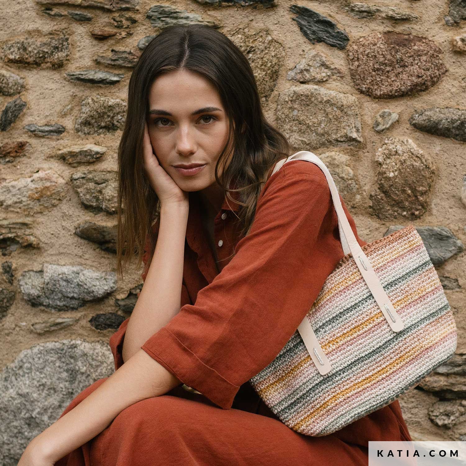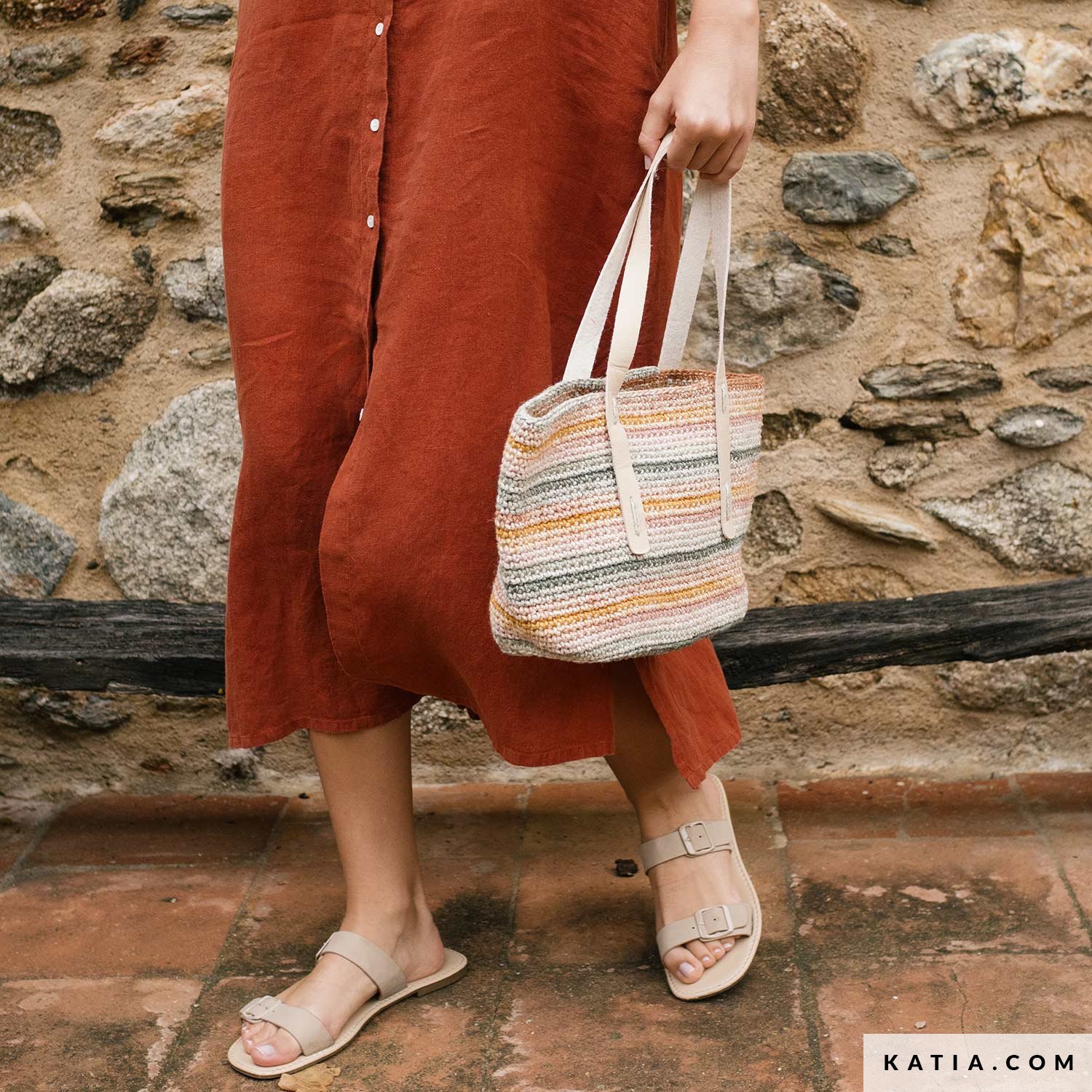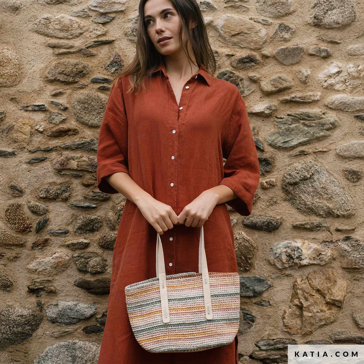 A crochet bag with matching base and straps, made with Katia The Vegan Bag Colors. Work in a spiral in single crochet for a sturdy result that’s easy to style. Free pattern available as a PDF at katia.com. Make one (or more) and carry it all summer long!