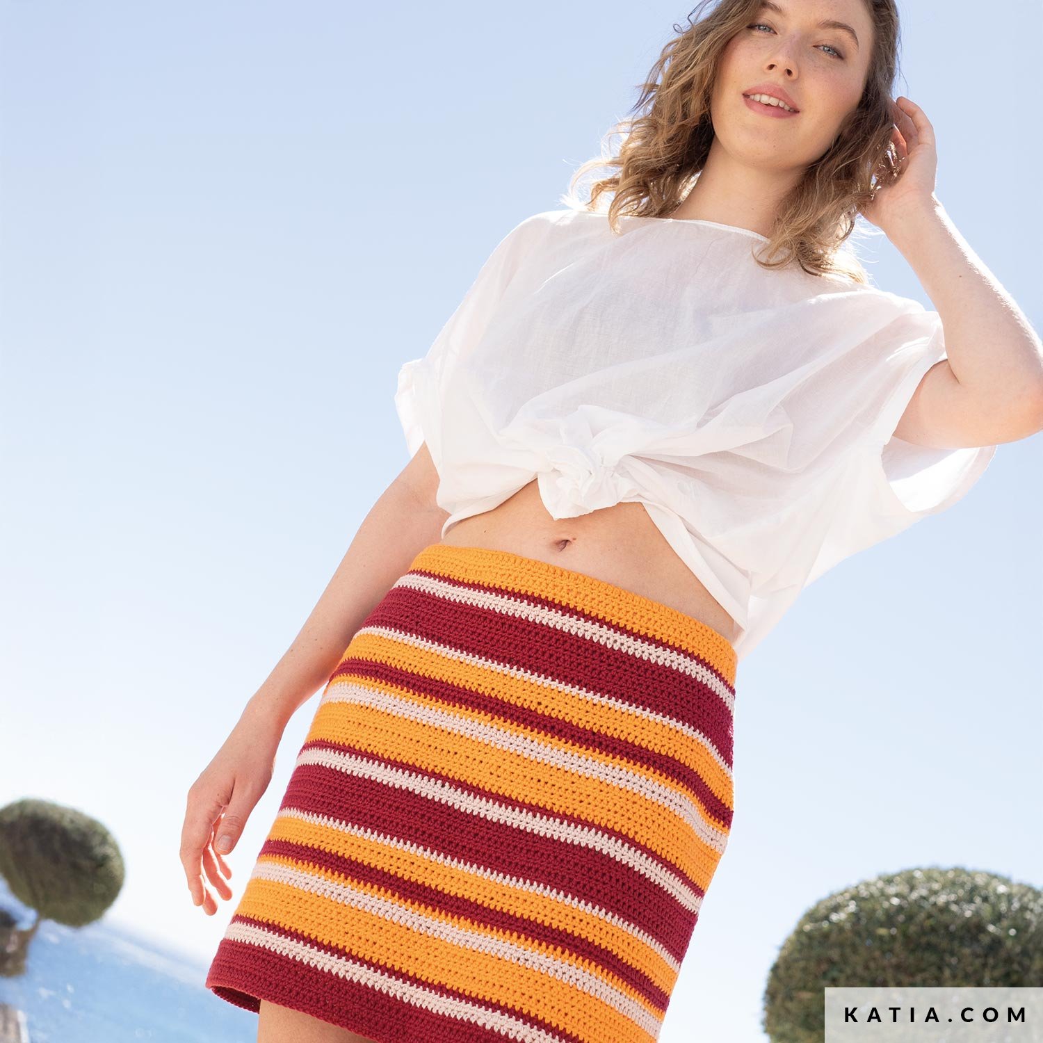 Add color and joy to your handmade wardrobe with this crochet mini skirt, made with Katia Cotton 100%, a cool and versatile cotton ideal for summer. Its irregular striped design in three colors allows you to experiment with unique combinations. Explore your creativity and fill every stitch with energy and fun.