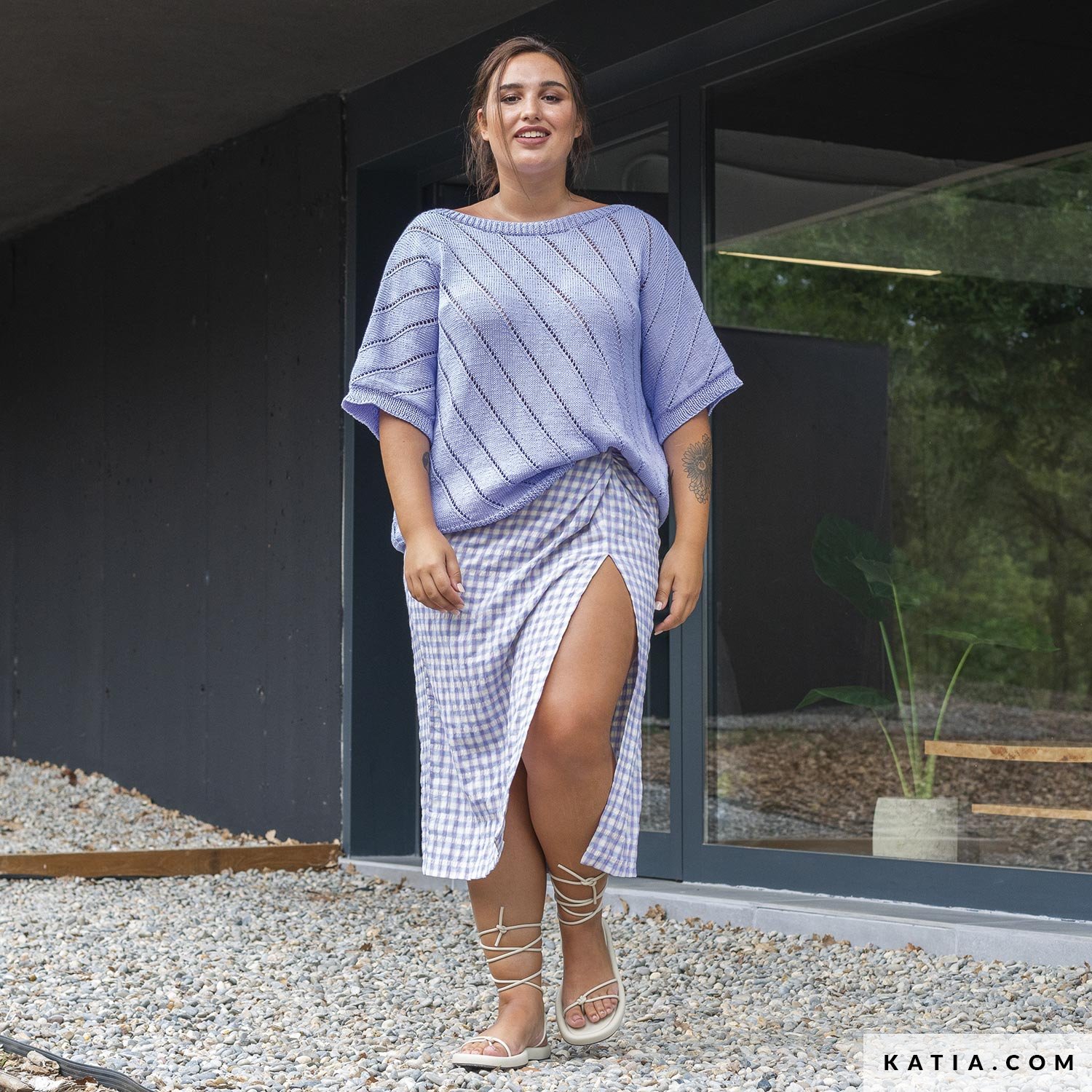 This summer, show off your style with this diagonal lace sweater with Japanese sleeves and a deep V-neckline at the back. A pattern from the Katia Plus design series, with instructions available in plus sizes to knit with trendy Tencel-Cotton colors.
