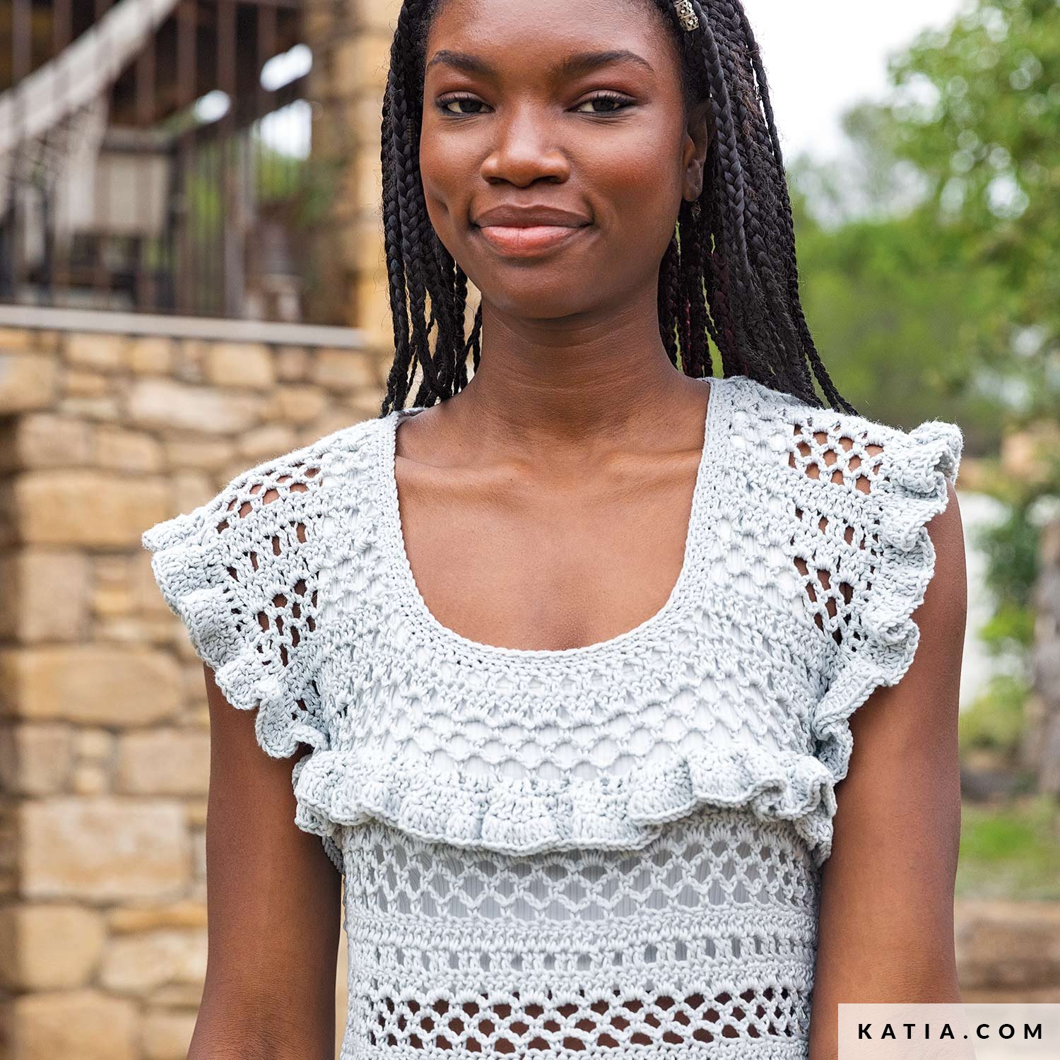 This women’s top with flounces is perfect for summer days! Made with SeaCell Cotton yarn, this lace top is cool and lightweight, perfect for hot weather. Its square neckline and flounces at the sleeves and across the chest add a feminine touch to this fun blouse.