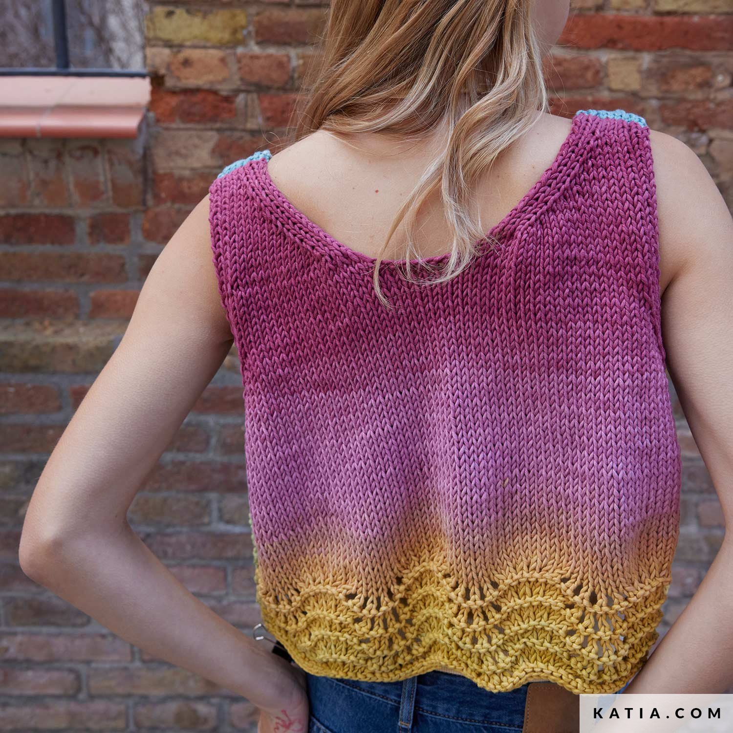 A short knitted vest, open at the front, with a delicate lace hem that creates a beautiful wave. The multicolor gradient of WOW Tote Bag is perfect for adding a pop of color to your everyday basics. A free pattern available as a PDF at katia.com. Watch the gradient unfold and make your favorite summer vest.