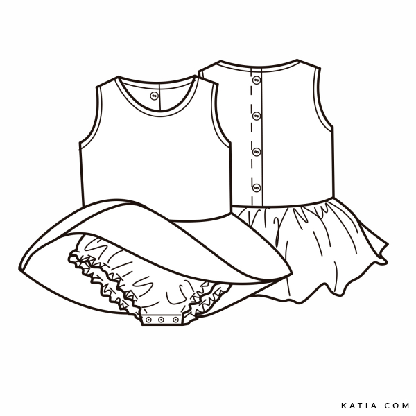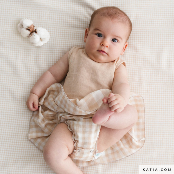 Cose este bonito vestido de bebé con braguita unida, ideal tanto para ocasiones especiales como para el día a día. El vestido sin mangas cuenta con un escote redondo, falda fruncida y cierre de botones en la espalda para facilitar el cambio. La braguita está unida para mayor comodidad y un ajuste perfecto. Un proyecto de costura práctico y lleno de ternura, recomendado para telas suaves como algodón, popelín o estampados ligeros de Katia Fabrics.