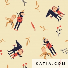 Tela de felpa con interior afelpado de pelo muy calentito y suave. Con fondo teja y estampado en negro de los personajes del cuento de caperucita roja. Ideal para prendas como sudaderas o cardigans.
