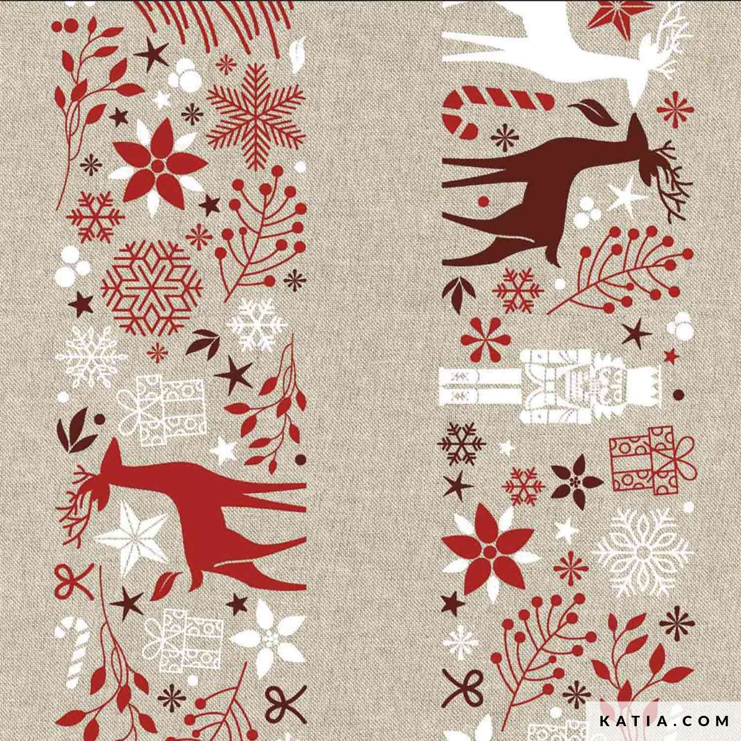 Tela de loneta reciclada con estampado de pequeñas estrellas en tonos rojos, marrones y blancos sobre un fondo arena. La tela de loneta Xmas Canvas Recycled Xmas Dreams de Katia Fabrics es una tela de gran calidad, muy resistente y de aspecto natural que es perfecta para crear un espectacular mantel para decorar tu mesa de Navidad, así como otros elementos navideños.