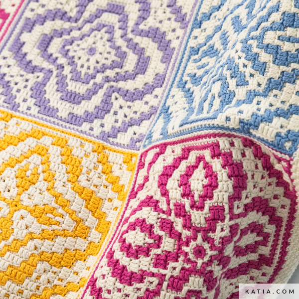 · Patrón con 5 gráficos diferentes y acceso a vídeos de apoyo para guiarte paso a paso en la técnica de mosaico crochet.