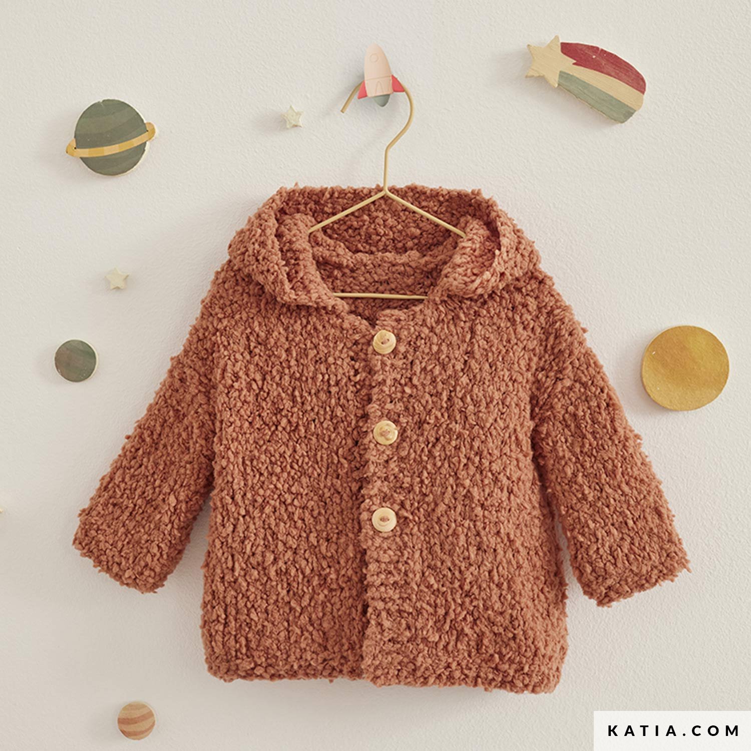 Gracias al patrón a dos agujas de la revista Katia Bebé 110, teje un cálido y suave abrigo para bebé usando la lana Katia Nuvole. Este abrigo con capucha tejido en una lana efecto peluche aporta calor y suavidad y es una prenda de invierno ideal para tu peque. ¡Prepara el armario de invierno de tu peque con este abrigo tejido con amor!
