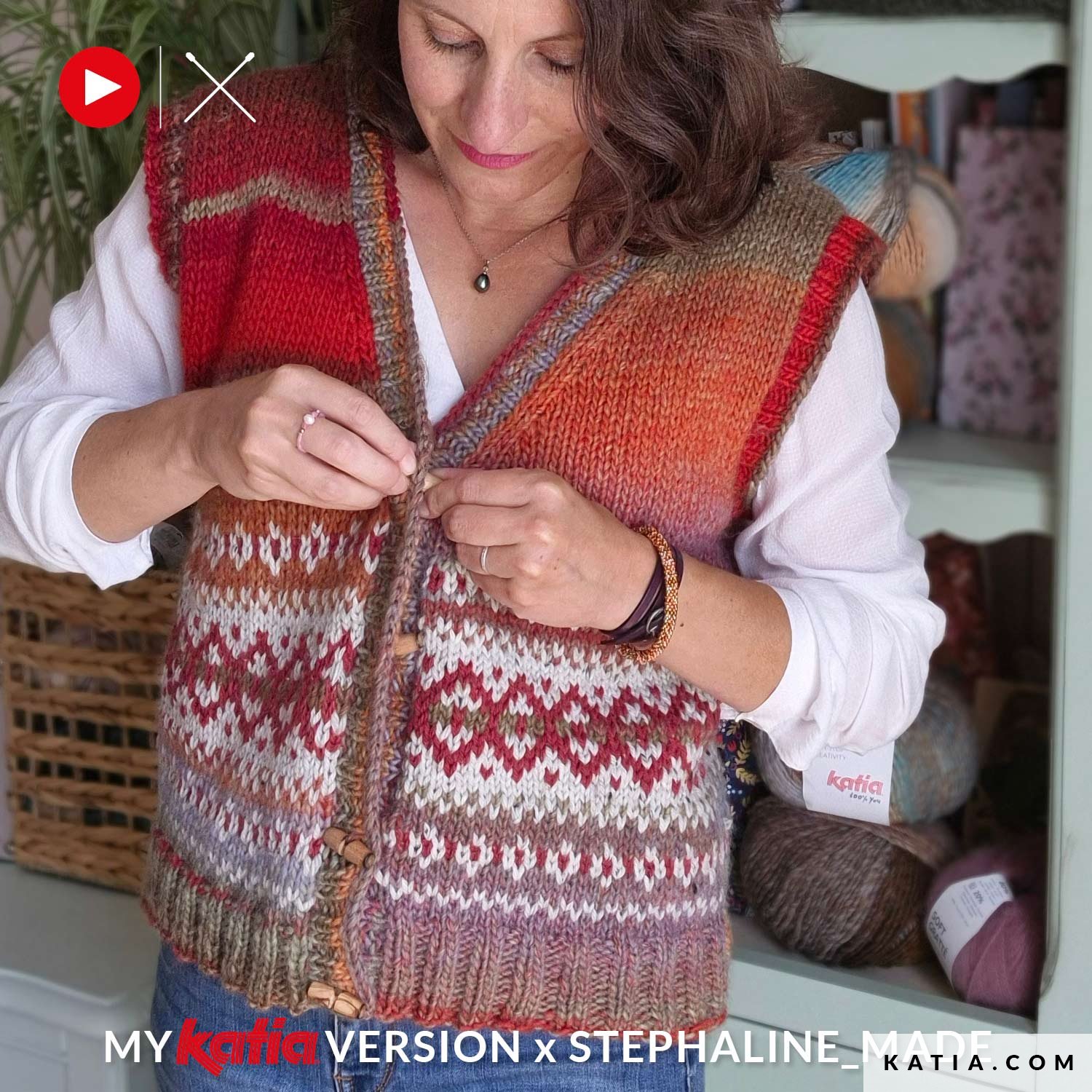 Descubre este chaleco con dibujo jacquard y botones tejido con Katia Azteca y Merino Tweed. Un proyecto fácil y rápido de tejer, ideal para disfrutar del color y la textura de Katia Azteca. Descubre en la sección My Katia Version del blog de Katia la reinterpretación de Stéphanie @stephaline_made de este diseño de la revista Katia Sport 75. Inspírate con las combinaciones de color y los consejos de Stéphanie siguiendo su vídeo paso a paso.