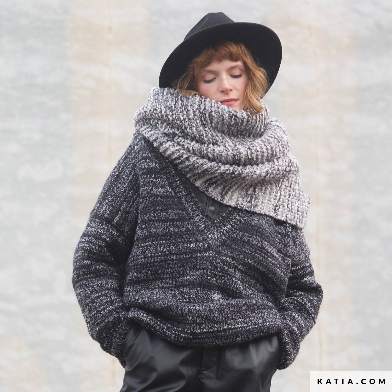 Un patrón doble para principiantes que quieren tejer su primer jersey oversize con cuello de pico y practicar el punto bobo con la maxi bufanda a juego.