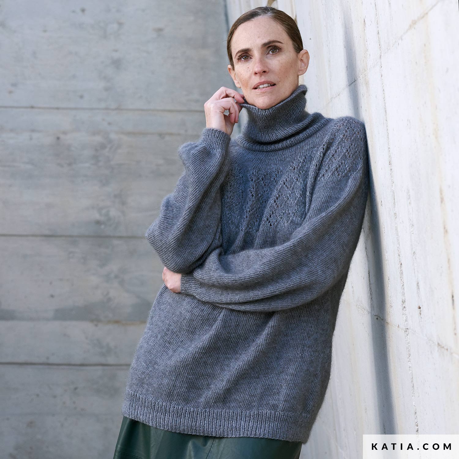 Este jersey de punto de manga abullonada y cuello alto tiene un canesú calado con una gran cenefa. Es un jersey básico, tejido con Mohair Cotton de abajo-arriba en circular. Es un patrón de estructura clásica, pero muy actual.
