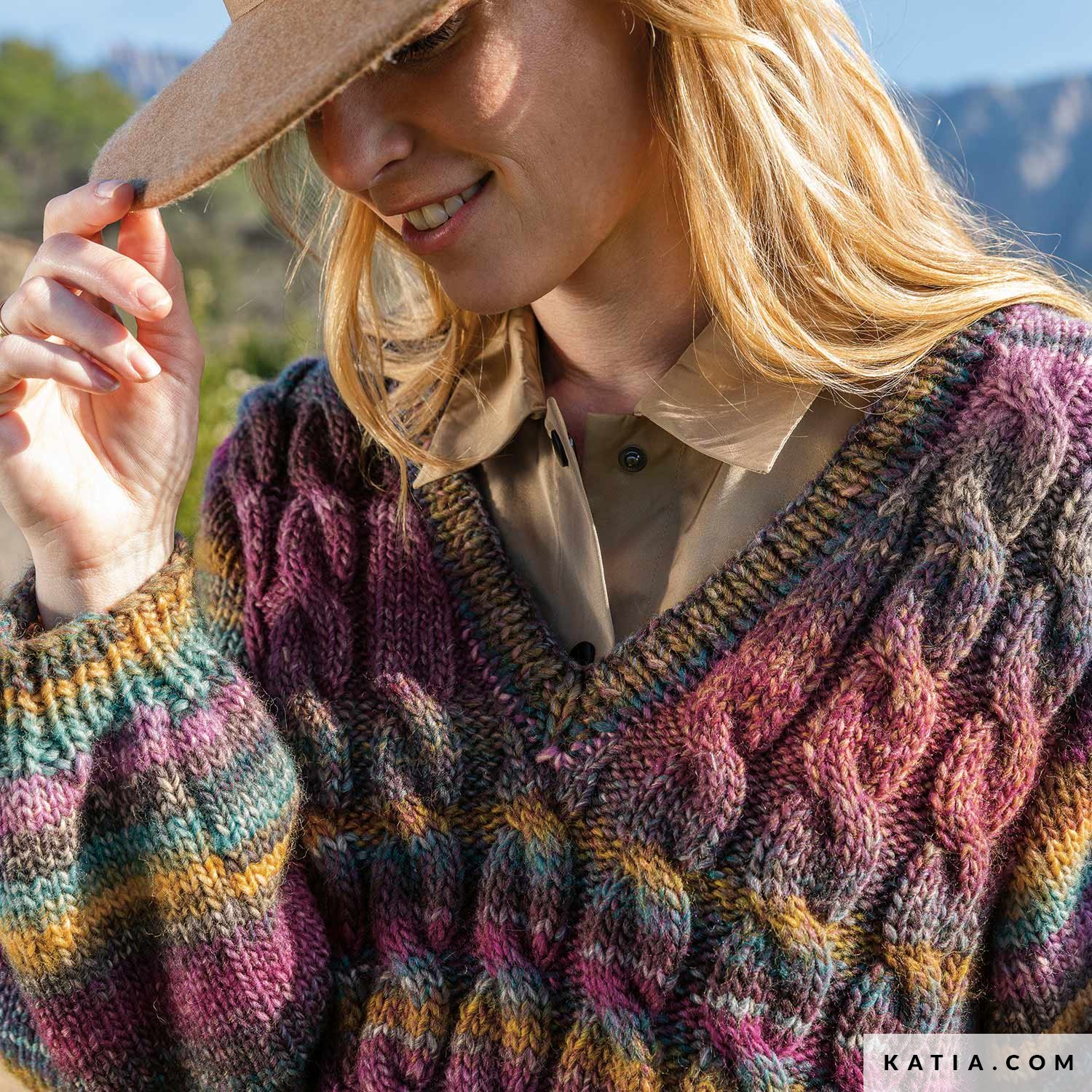 Suave pullover con ochos y escote en V tejido con agujas rectas. El patrón incluye las explicaciones paso a paso para tejer desde la talla 38 a la 52.