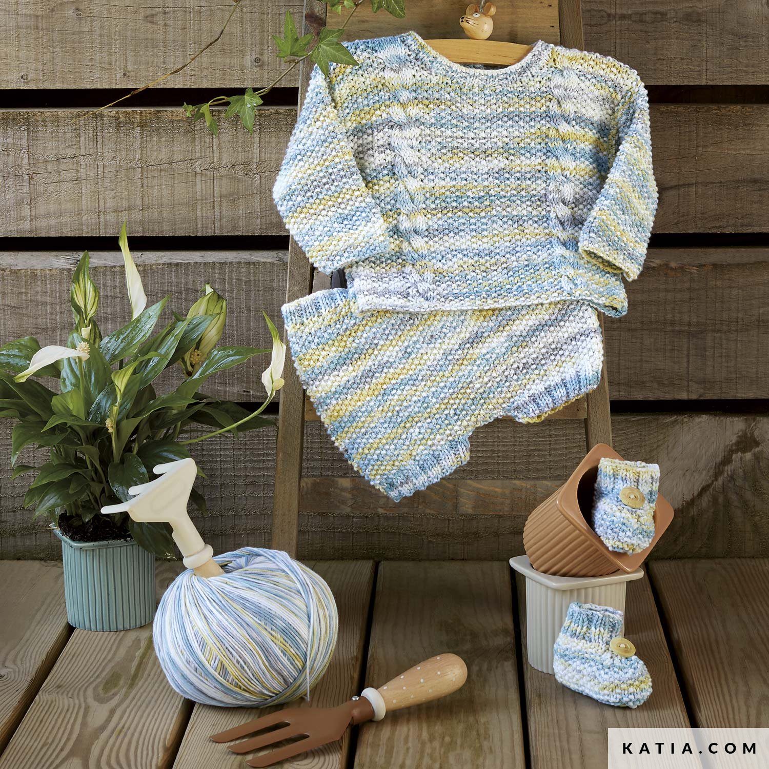 Tan solo necesitas un ovillo Katia Mimosa de 200 gramos para tejer este encantador conjunto de bebé. Viste a tu bebé con camiseta, cubrepañal y patucos a juego tejidos en algodón 100% estampado. Este patrón está disponible en tallas prematuro, recién nacido y 3 meses.