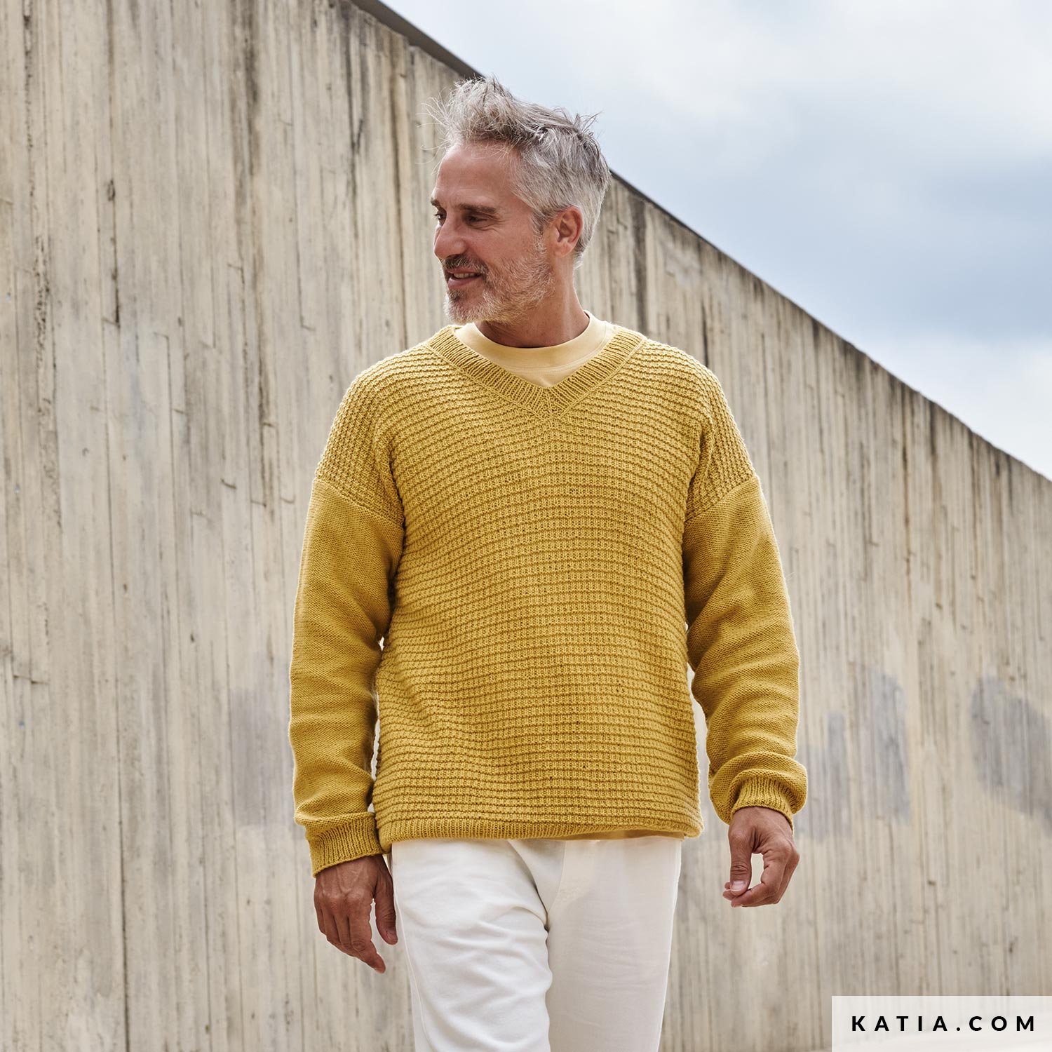 El patrón de jersey a dos agujas para hombre de la revista All Seasons 6, tejido con la suave Comfort Cashmere de Concept by Katia, es perfecto para cualquier estación. Con un elegante escote en pico y un punto relieve en el cuerpo, es una prenda atemporal que combina fácilmente con todo tu armario. ¡Empieza a tejer tu propio estilo!