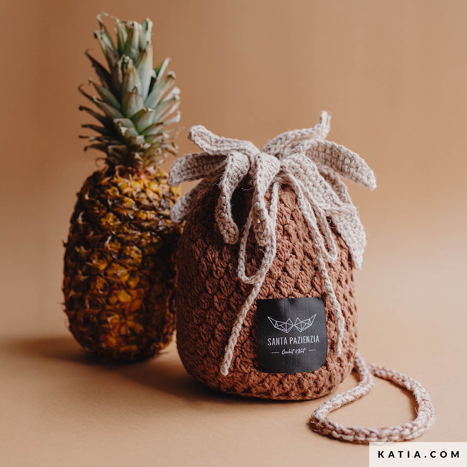 El patrón incluye instrucciones detalladas y vídeos paso a paso para disfrutar del proceso con calma. El cuerpo se hace en punto piña para dar volumen y textura y se cierra con un sencillo cordón a ganchillo. Las hojas se trabajan por separado y se cosen al final para conseguir esa silueta de piña tan reconocible. Por último, el asa larga se hace a ganchillo en hebra doble combinada en dos colores.