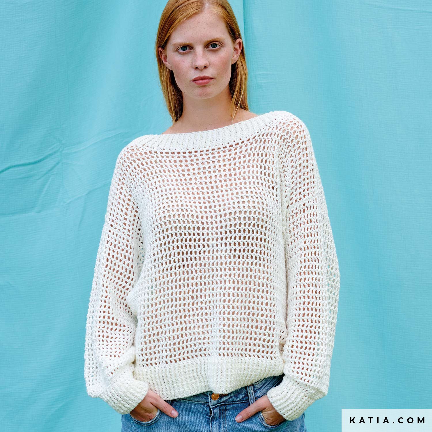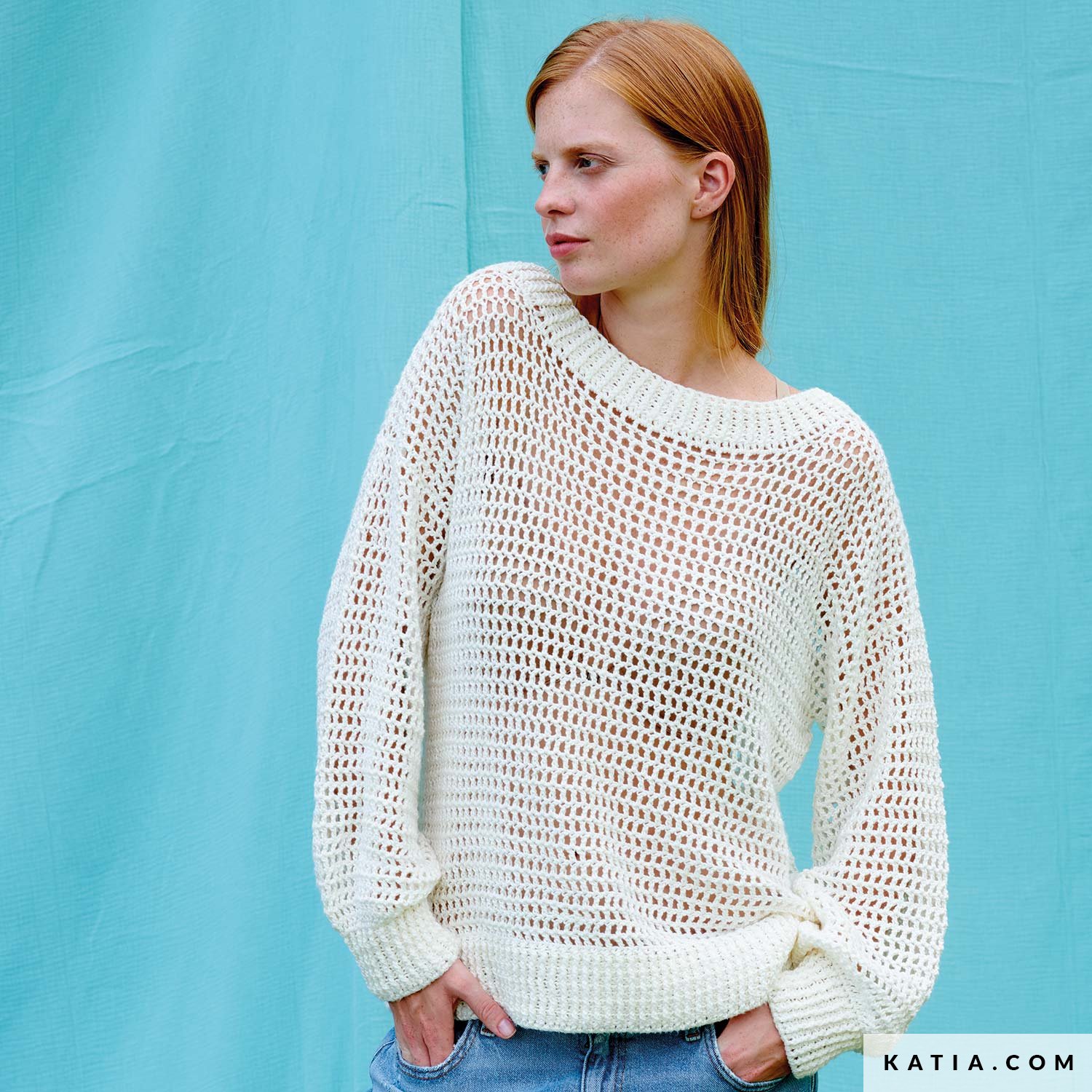 Este jersey de cuello barco para mujer está hecho a ganchillo en punto red resaltado por grandes elásticos en puños, cuello y bajo. El hilo Dama es un hilo de fibras naturales que le da una textura única a este jersey, y lo hace perfecto para ser una pieza atemporal en tu fondo de armario. Es un jersey súper ponible que combina con todo tipo de prendas.