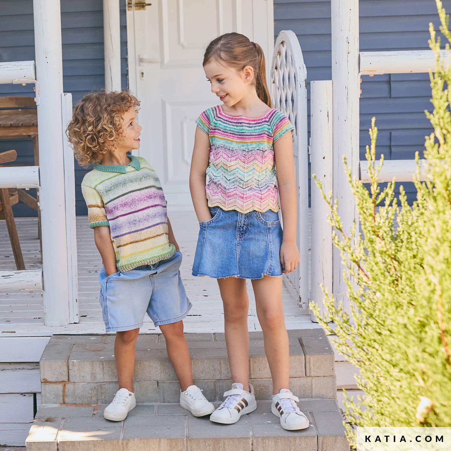 Este top ligero se teje en redondo con agujas circulares, de arriba abajo, para un ajuste cómodo y sin costuras. Katia Fair Cotton Arlequino aporta un estampado en ciclo perfecto que llena de color todo el diseño. El delicado punto fantasía crea un bonito efecto de ondas en el bajo y las mangas raglán añaden comodidad. Teje una prenda fresca y colorida para el armario handmade de tu hija con un solo ovillo.