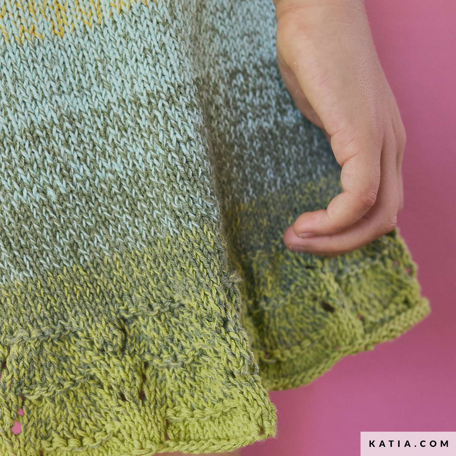 Vestido de niña tejido en redondo con agujas circulares, en una sola pieza, desde el bajo y con un delicado calado. Gracias al colorido de Katia Pop-Up Cotton, cada vestido queda único. Patrón gratuito disponible como PDF en katia.com. ¡Teje un vestido ligero y lleno de color!