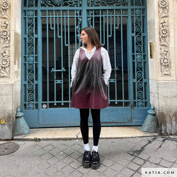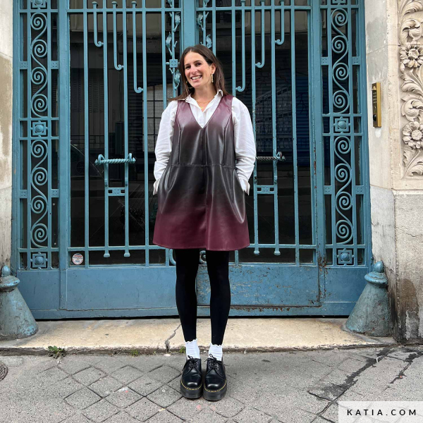 Choisissez le tissu Simili Cuir Vegan Dégradé de Katia Fabrics, un tissu doux et souple avec un magnifique effet dégradé qui apporte une touche originale à votre look. Pour une version plus décontractée, vous pouvez également coudre ce patron avec un tissu en denim.