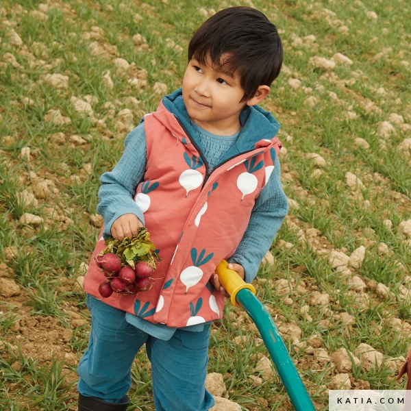 Patron de couture de gilet sans manches à capuche taille Kids (de 86 cm à 104 cm). Cousez ce gilet sans manches grâce au gabarit de couture du catalogue de patrons de couture Cottagecore Automne-Hiver 22/23 de Katia Fabrics.