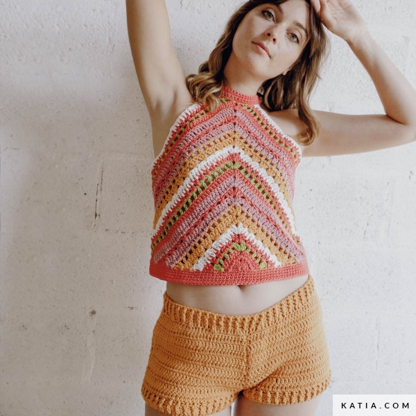 Cet été, portez des vêtements modernes et colorés grâce à l'ensemble Levante by Katia! Crochetez un top avec un col halter qui s'attache dans le dos dans un mélange de couleurs vives du fil United Cotton et plusieurs points qui créent un motif en forme de flèche. Complétez votre look avec un short crocheté en brides et en côtes. Préparez-vous pour profiter de l'été dans cet ensemble léger!