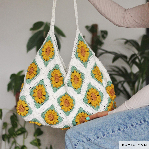 Emportez partout votre sac tournesol ! Crochetez 29 tournesols sous forme de granny squares, assemblez-les et portez fièrement votre sac Sunflower créé par @knittingtheskyline. Vous avez juste besoin d'un pack de 20 pelotes de Katia United Cotton en 4 couleurs différentes : écru, jaune moutarde, marron et vert. Ce pack de pelotes 100 % coton, qui s'accompagne d'un modèle complet avec des graphiques (PDF) et un tutoriel vidéo, est une jolie idée cadeau pour la Fête des Mères. Complétez votre pack Katia Cotton United pour crocheter le sac Sunflower avec un crochet de 5 mm et un autre de 6 mm, une paire de ciseaux et une aiguille à tapisserie.