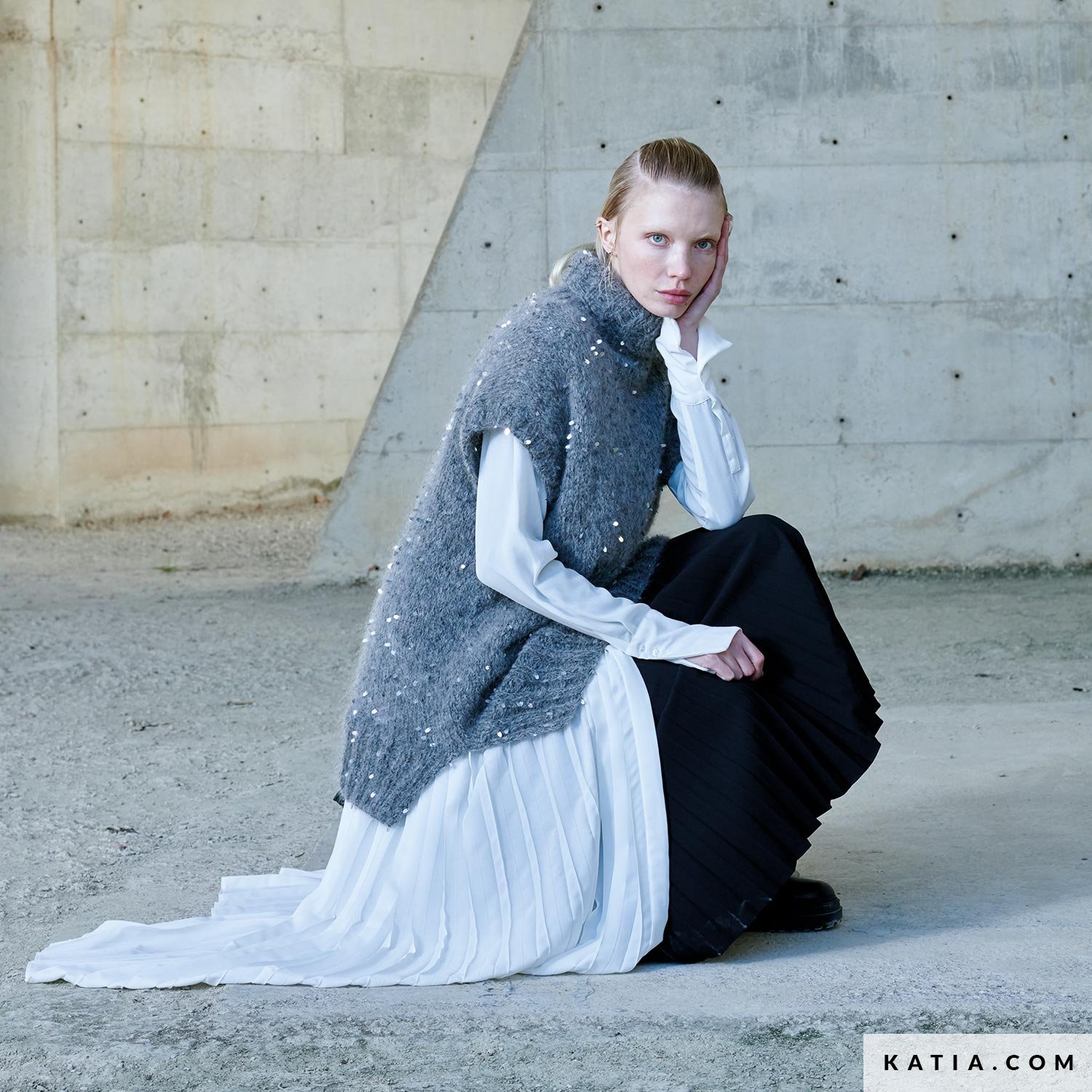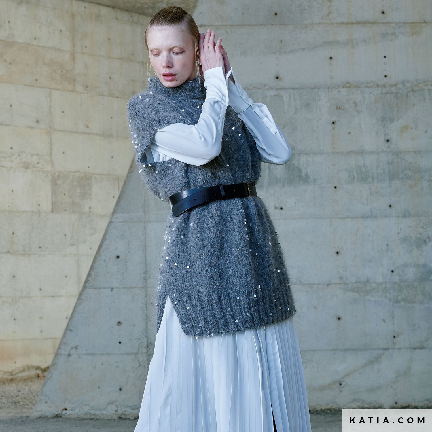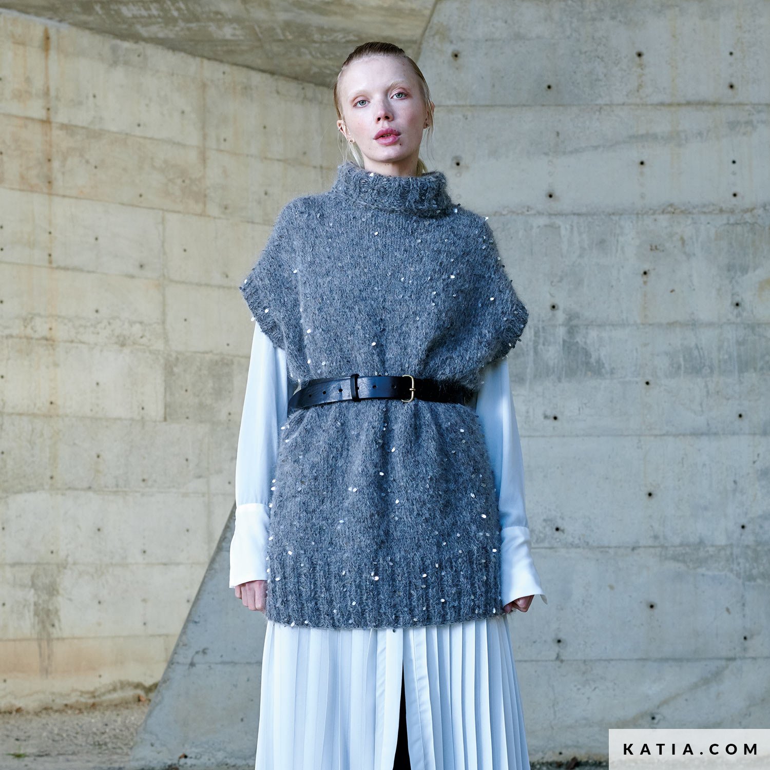 Ce magnifique pull long et sans manches à paillettes est parfait pour ajouter une touche de sophistication à toutes vos robes longues. Les ouvertures latérales, les grandes côtes et le col roulé en font une pièce élégante. De plus, le fil Casiopea à paillettes donne un aspect chic à ce pull facile à tricoter.