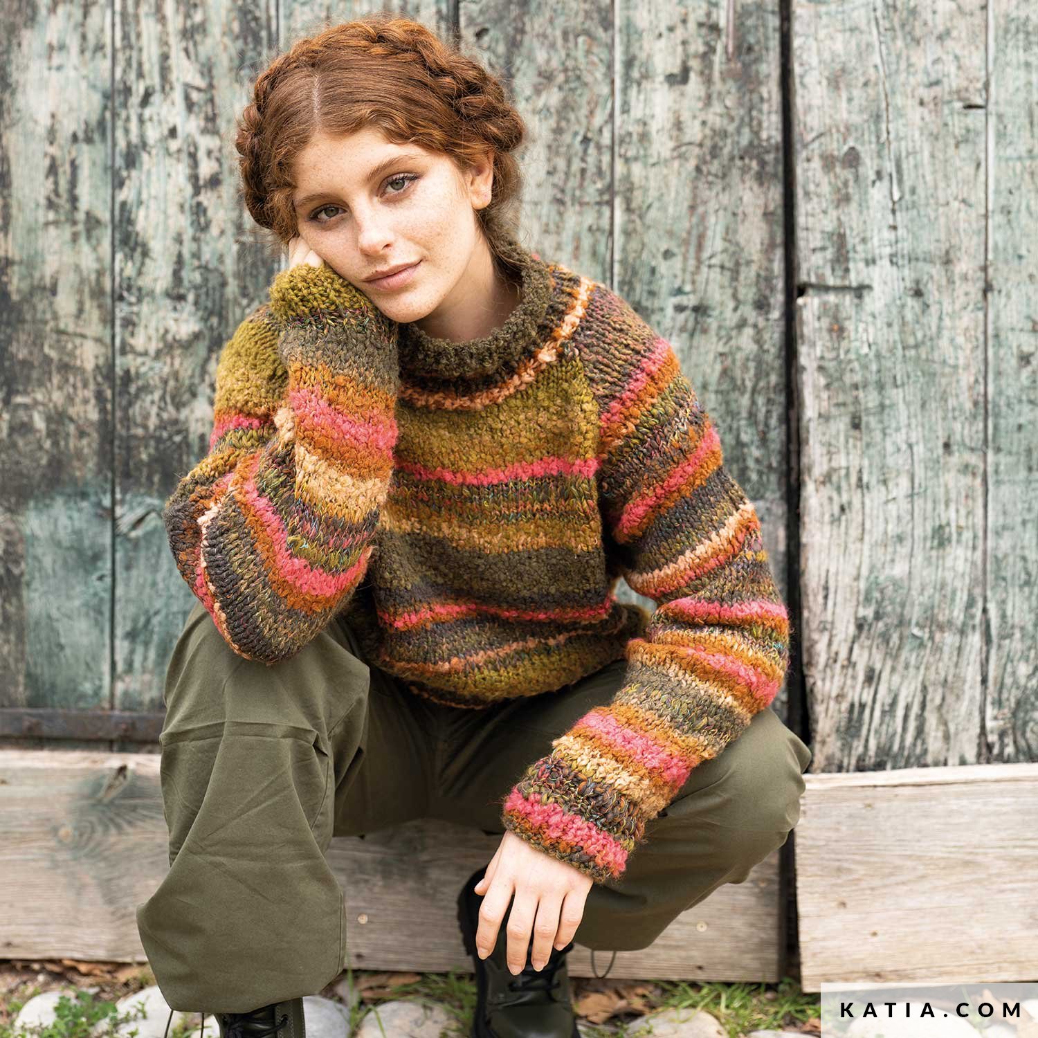 Alliez style rétro et modernité dans une même tenue grâce à ce pull multicolore et riche en texture provenant du catalogue Katia Sport 115. Son col roulé et son effet dégradé irrégulier en font une pièce unique. Tricotez des vêtements esprit vintage dans la laine fantaisie Katia Funk pour obtenir un superbe résultat.