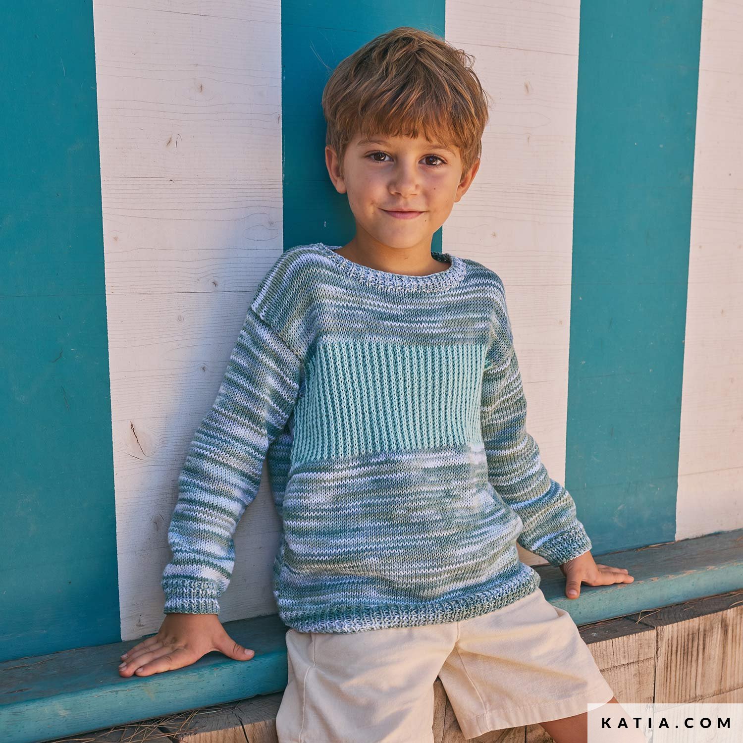 Tricotez ce patron de pull avec Katia Capri Tones, un coton doux à effet délavé qui crée un joli jeu de couleurs. La bande en jacquard sur le devant dessine des lignes verticales contrastant avec l'effet multicolore du fil, pour une touche moderne et ludique. Modèle disponible dans le catalogue Katia Enfant 117 et en PDF sur katia.com. Créez une pièce légère qui deviendra le vêtement préféré de votre fils ou de votre fille.