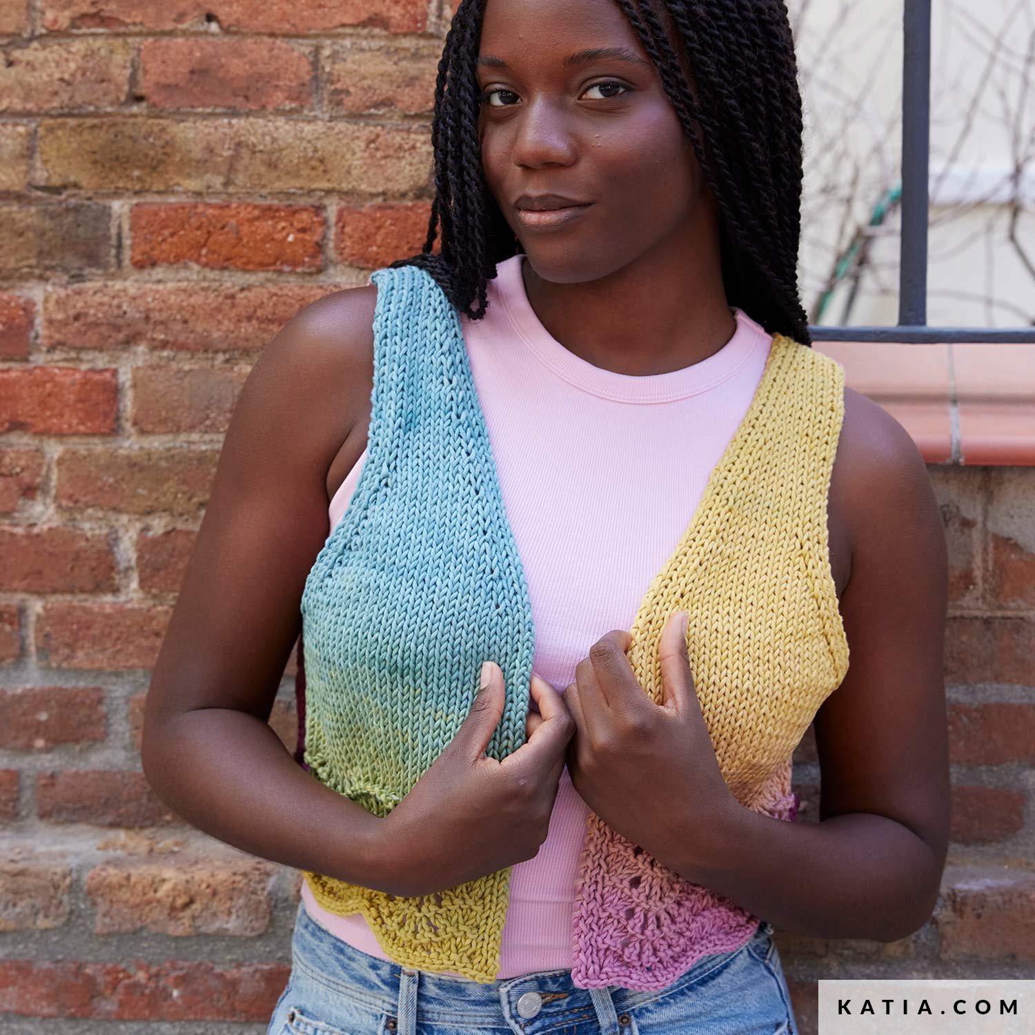 Modèle tricot de gilet sans manche court et ouvert sur le devant, avec un joli motif ajouré en forme de vague sur le bas du corps. Le dégradé multicolore de WOW Tote Bag est parfait pour ajouter une touche de couleur à tous vos looks basiques. Modèle de tricot gratuit disponible en PDF sur katia.com. Découvrez les couleurs du dégradé tout au long du tricot en créant votre nouveau vêtement préféré pour cet été.