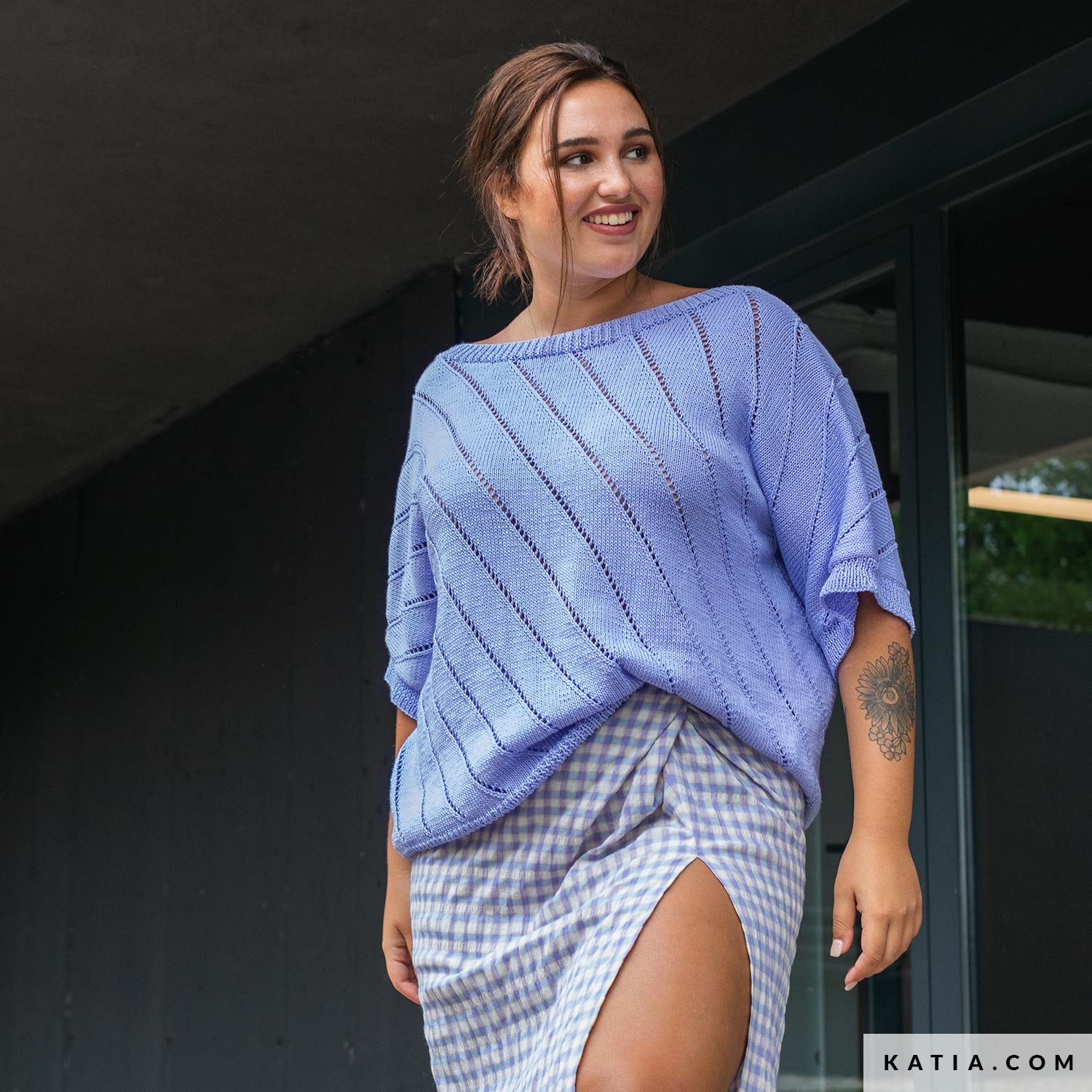 Cet été, montrez que vous avez du style en portant ce pull à rayures ajourées en diagonale, à manches japonaises et avec un grand décolleté en V dans le dos. Un modèle de la série de patrons Katia Plus dont les explications sont disponibles en grandes tailles et que vous pouvez tricoter dans les couleurs tendance de Tencel-Cotton
