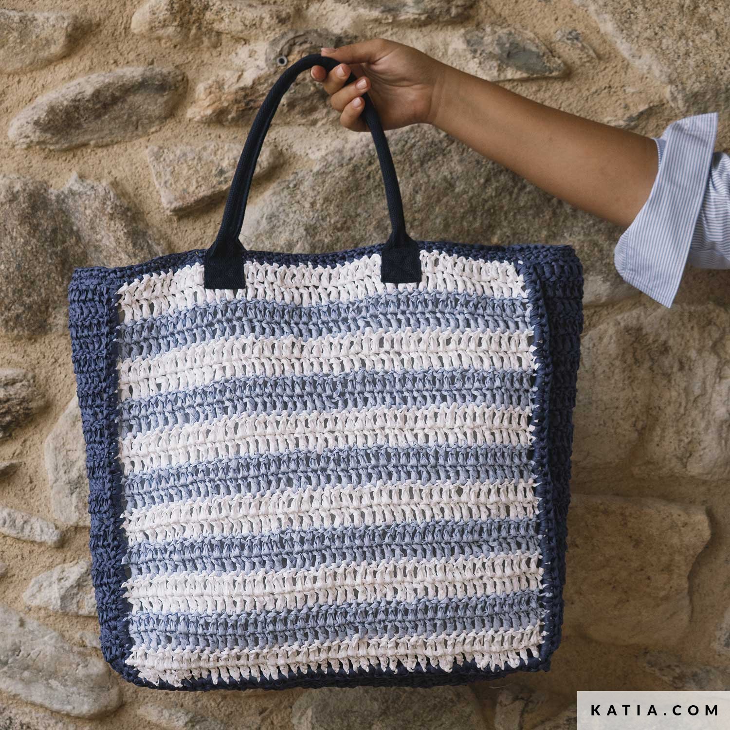 Design au crochet de sac à rayures dans des coloris contrastés, idéal pour vos looks d'été les plus décontractés : pour une balade à la plage ou une promenade au marché. Le fil Katia Raffia X-Treme permet de bien maintenir la forme du sac et assure des finitions impeccables. Retrouvez le modèle sur katia.com et dans le catalogue Bag to Basics. Amusez-vous avec les couleurs et portez votre sac au crochet pendant tout l'été.