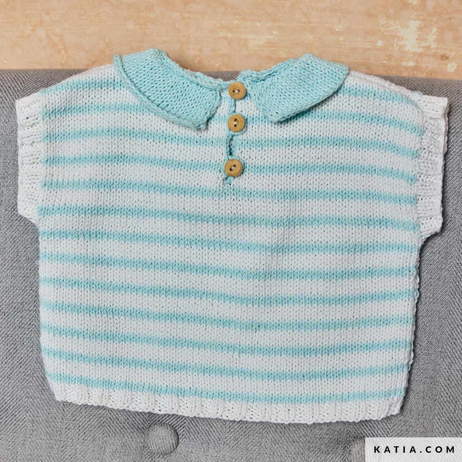 Ce patron de tee-shirt pour bébé se tricote avec Concept Cotton-Cashmere. Ce modèle à manches courtes se caractérise par un volant autour du col, de fines rayures et un amusant crabe brodé au point jacquard. Disponible dans le catalogue Katia Layette 116 et en PDF sur katia.com. Tricotez une pièce estivale et ludique pour votre bébé.