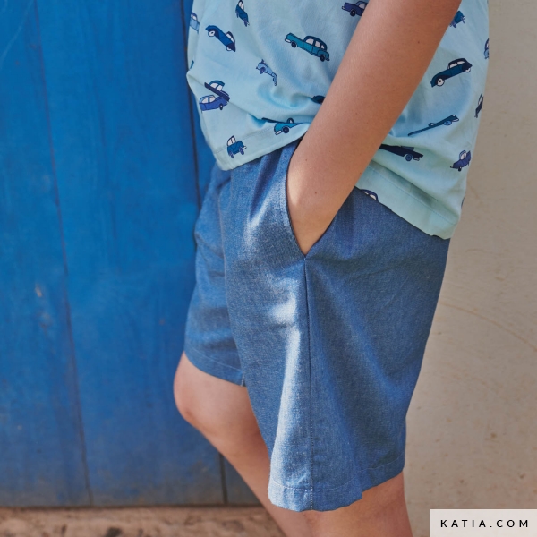 Se quello che cerchi è un modello di pantaloncino elegante e comodo con tasche per il tuo bambino, questo modello è l'ideale, dato che è dotato di elastico in vita. Cuci questo modello seguendo le istruzioni passo dopo passo che trovi nella nuova rivista di modelli di cucito Travel Postcards Primavera-Estate 2024 di Katia Fabrics. Questi pantaloni sono perfetti per essere cuciti con tessuti come i denim estivi di Katia Fabrics o i tessuti di lino e cotone. Se vuoi ottenere dei pantaloni più sportivi, puoi cucirli anche con tessuti elastici come il Jersey in tinta unita o il nuovo tessuto Sporty Sweat di Katia Fabrics. Diventerà sicuramente un punto fermo nel guardaroba fatto a mano del tuo piccolo.