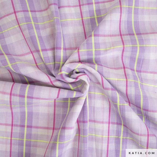 Tessuto per camicie a quadri nei colori giallo neon e lilla. Il tessuto Fluor Madras Neon & Lilac a scacchi di Katia Fabrics è un tessuto sottile, leggero e con una grammatura di 95 g/m², è perfetto per cucire capi come camicie e vestiti. Nelle riviste di modelli di Katia Fabrics ci sono modelli perfetti per cucire magliette o abiti ideali per questo tessuto a quadretti.