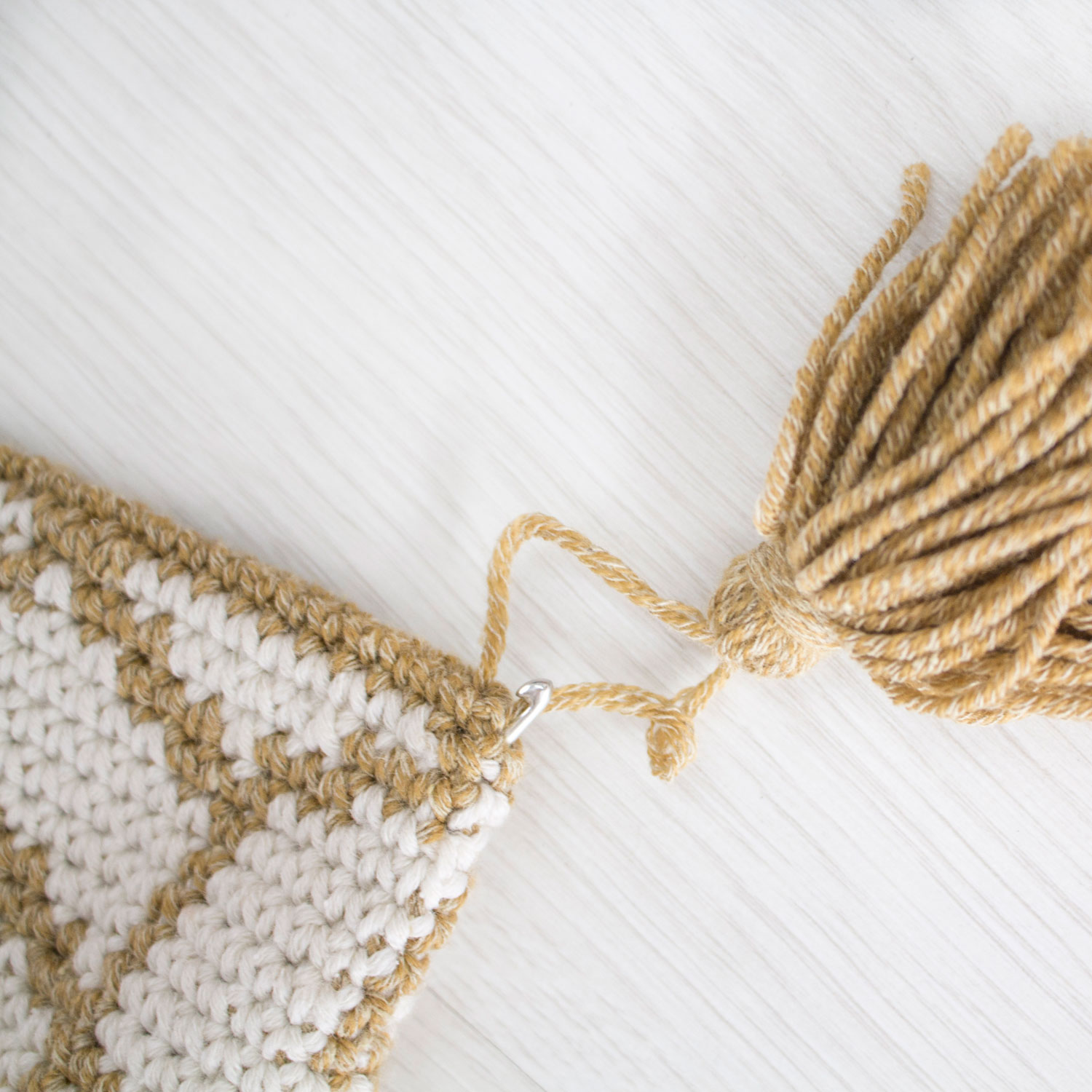 Per disegnare questo cuscino mi sono ispirata ai motivi geometrici di tendenza nella decorazione. Le linee fini dai toni dorati su sfondo bianco apportano luce ed eleganza a qualsiasi stanza. Ho deciso di aggiungere delle nappe agli angoli per dare un tocco bohemien e casual. Mi piace moltissimo lo stile boho chic. Siccome volevo fare un lavoro con uno schema geometrico dalle linee sottili, ho scelto Katia Merino Seda. Una lana dalla morbidezza eccezionale che si sposa perfettamente a questo progetto.Senza Dubbio, quello che più mi piace è il suo aspetto melangeato, che le da un tocco più rustico.