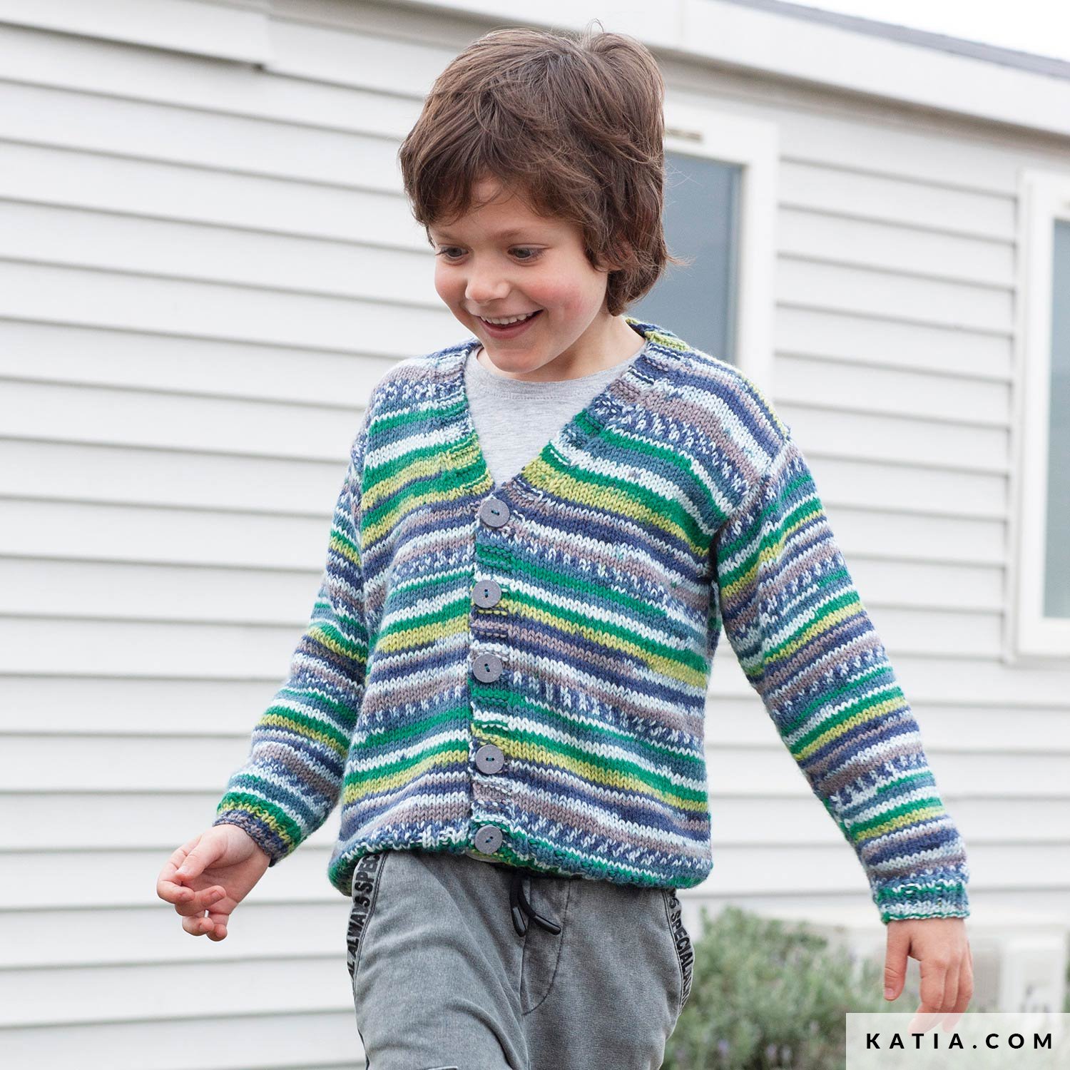Cardigan ai ferri con asole e bottoni, semplice da lavorare con i ferri diritti. Un capo classico, rinnovato dalla stampa multicolore di Baby Jacquard. Una giacchetta comoda, perfetta da indossare in qualunque occasione.
