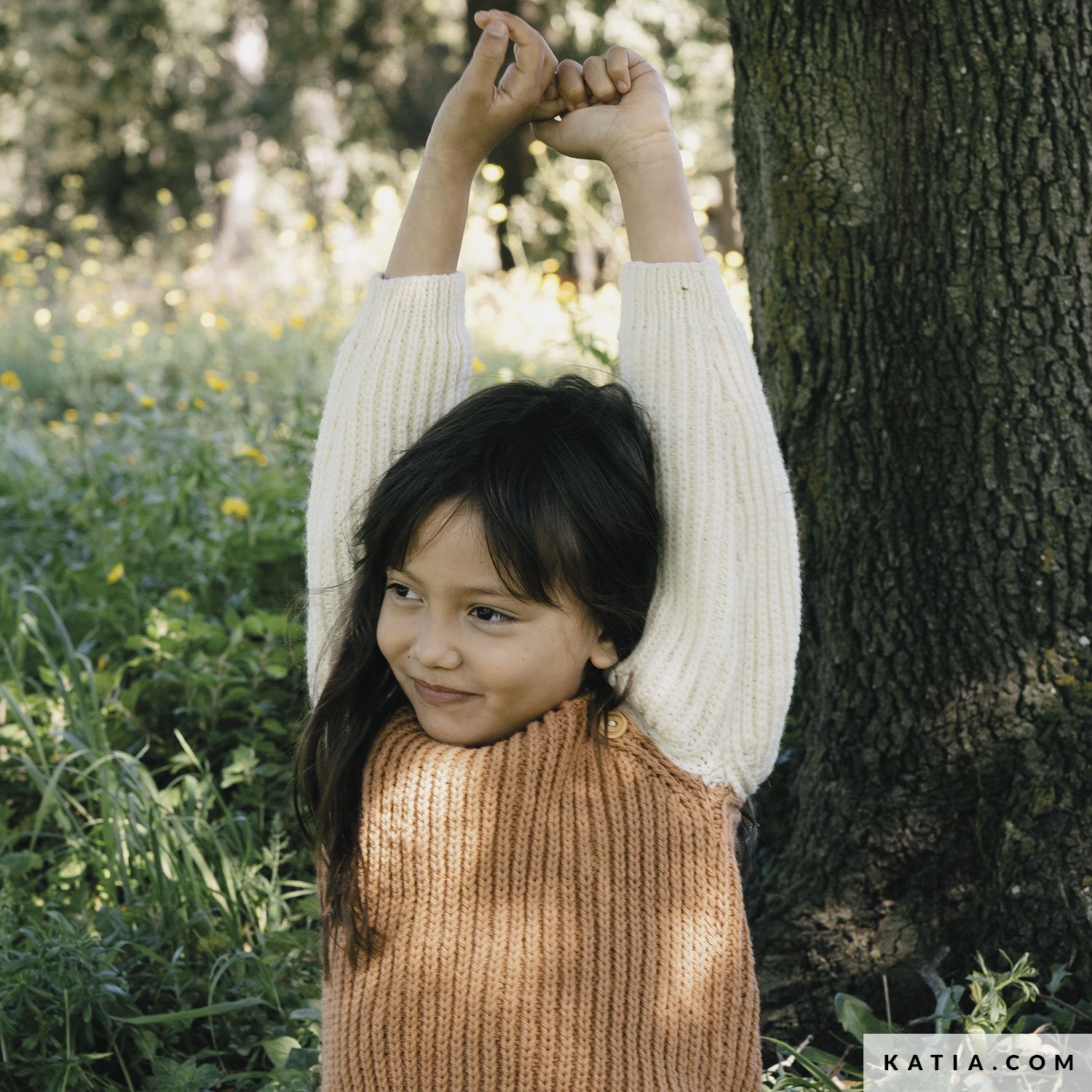Hai bisogno solo di scegliere due colori autunnali della favolosa lana Arles Merino per realizzare il maglione a coste inglesi di questa bambina. Rilassati lavorando ai ferri un bel modello bicolore con maniche raglan in un colore contrastante con il resto del corpo. Il motivo è completato da piccole aperture su entrambi i lati della vita e 3 bottoni in legno per chiudere uno dei giromanica raglan.