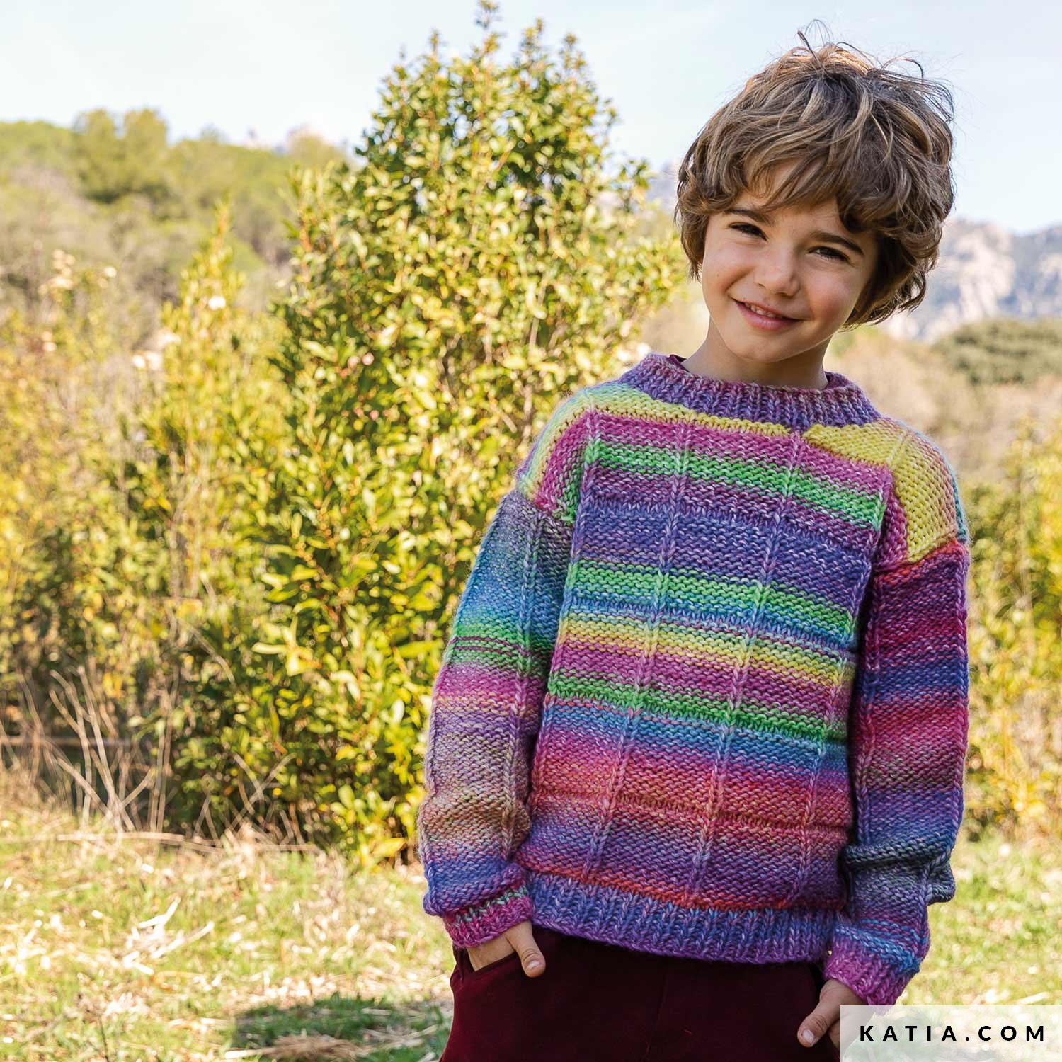 Allegra maglia da bambino con originali rilievi a forma quadrata. Lavora facilmente con i ferri diritti seguendo le nostre istruzioni e i grafici.