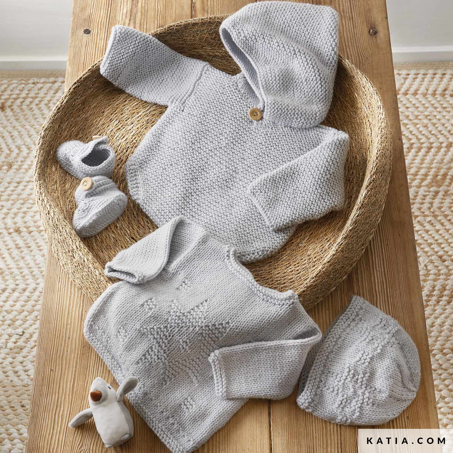 Ti proponiamo un modello facile per lavorare una maglia da neonato con una stella sul davanti con il filato Katia Baby Ultrasoft. Crea un motivo geometrico semplice solo lavorando a legaccio in contrasto con la maglia rasata basica.