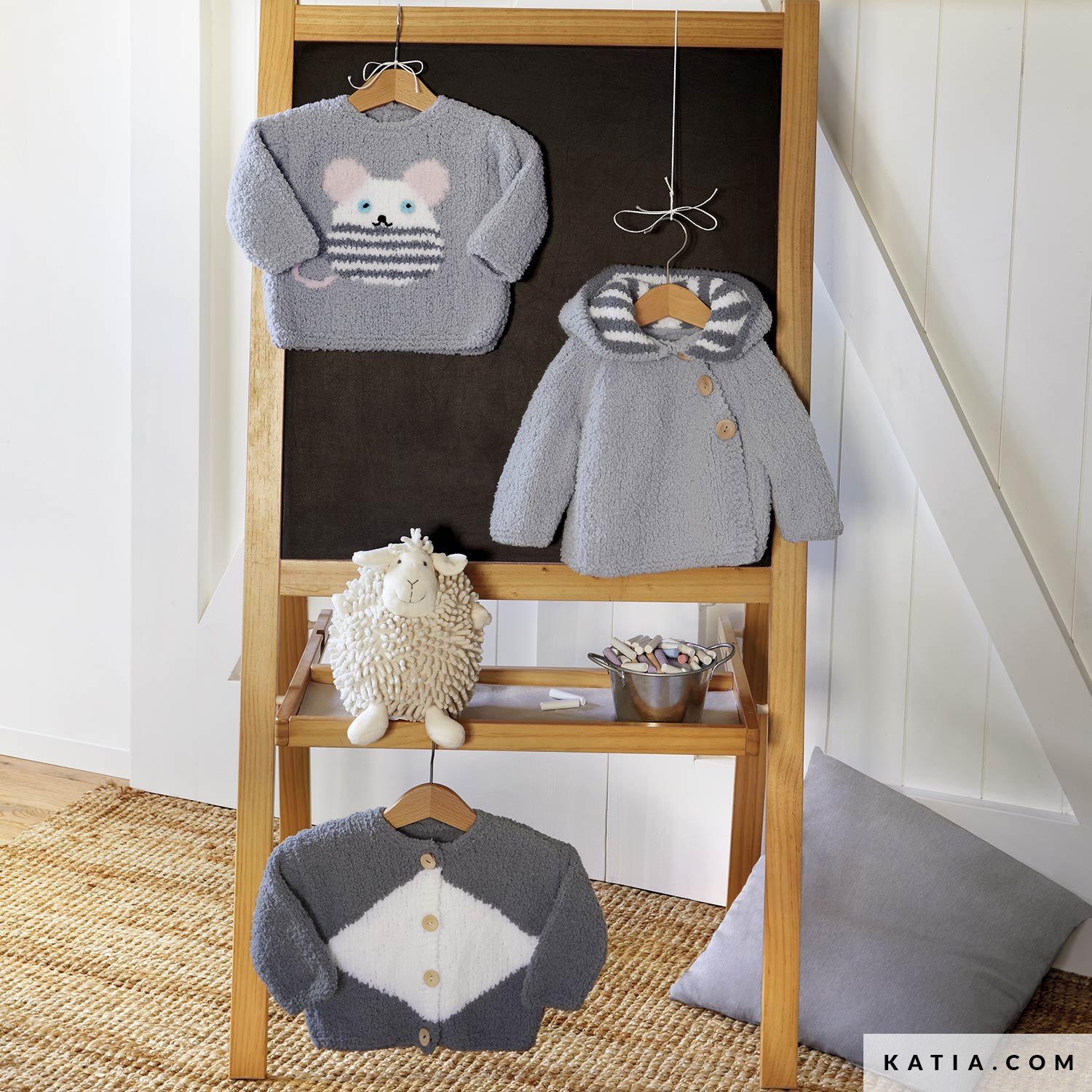 Se cerchi un modello per lavorare una maglia divertente ai ferri questo modello della rivista Katia Bebè 102 è perfetto! Divertiti lavorando con Katia Copito Soft una maglia da bebè con un simpatico topolino a intarsia.